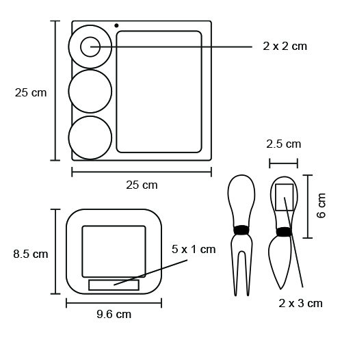 Tabla de quesos que incluye 3 mini platos de cerámica, un tenedor para quesos y un cuchillo.