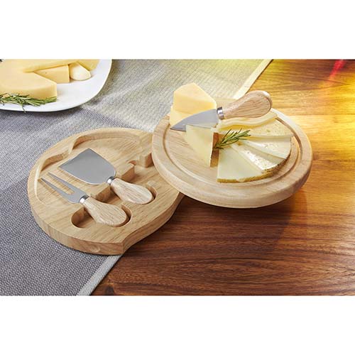 Set de madera deslizable con 2 cuchillos y 1 tenedor para quesos. La madera es un producto natural el cual puede presentar variaciones en tonalidades y vetas.