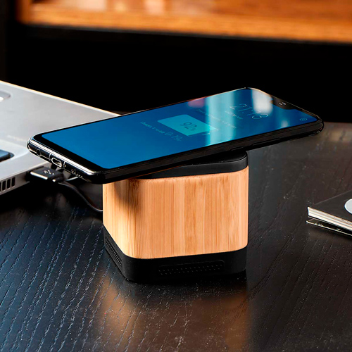 Bocina bluetooth con bateria recargable. Reproduccion de musica de 2 hrs aproximadamente. Controles integrados de llamadas, volumen y reproduccion de audio. Rango de conexion de 10 metros. La base al estar conectada, funciona como cargador inalambrico de smartphone. Incluye cable cargador USB.