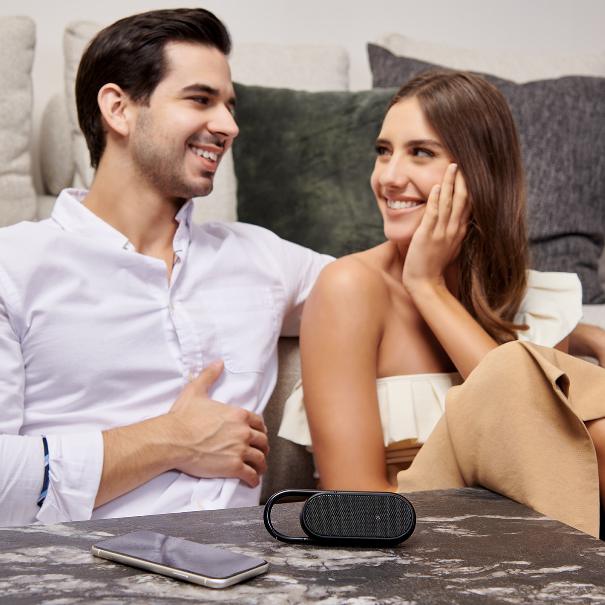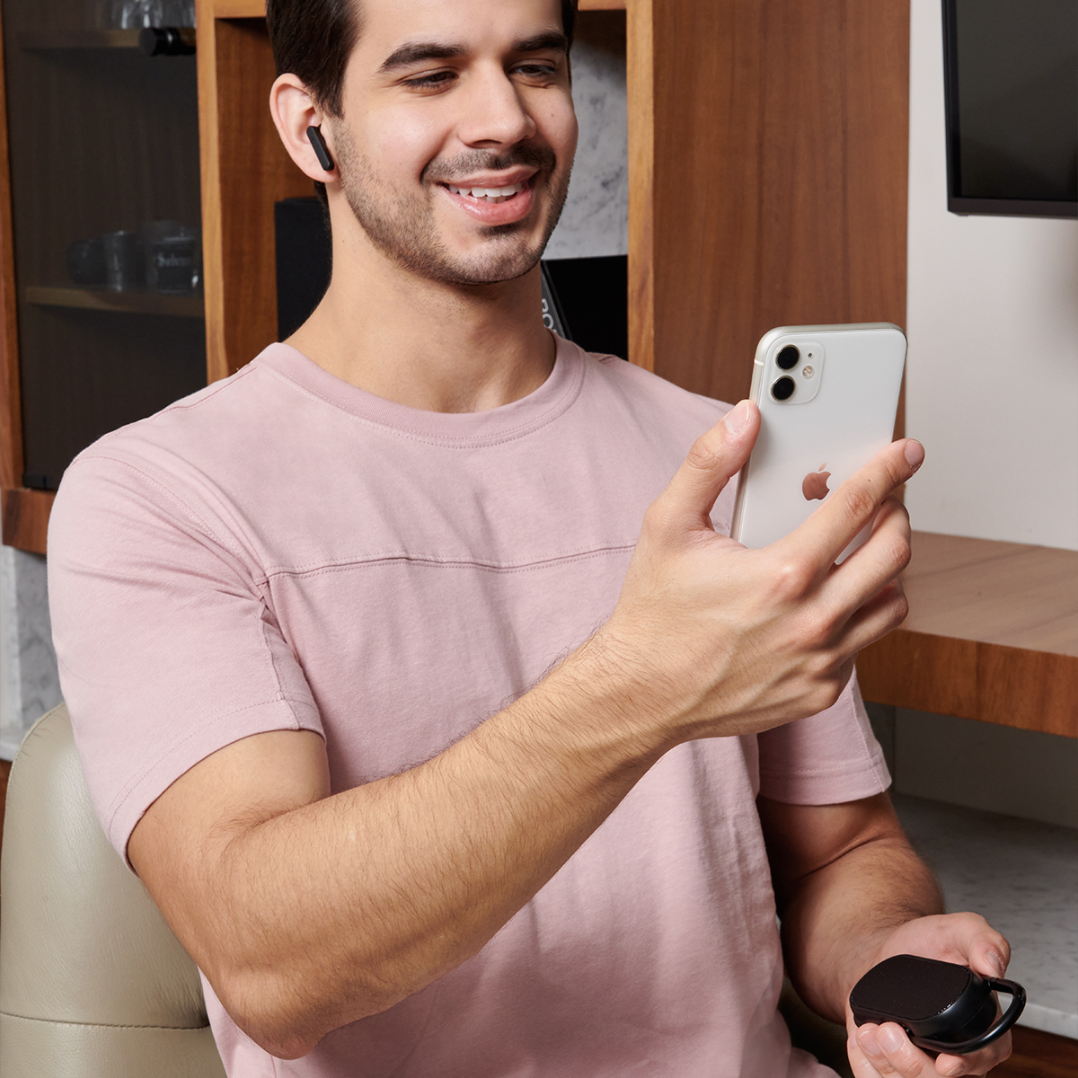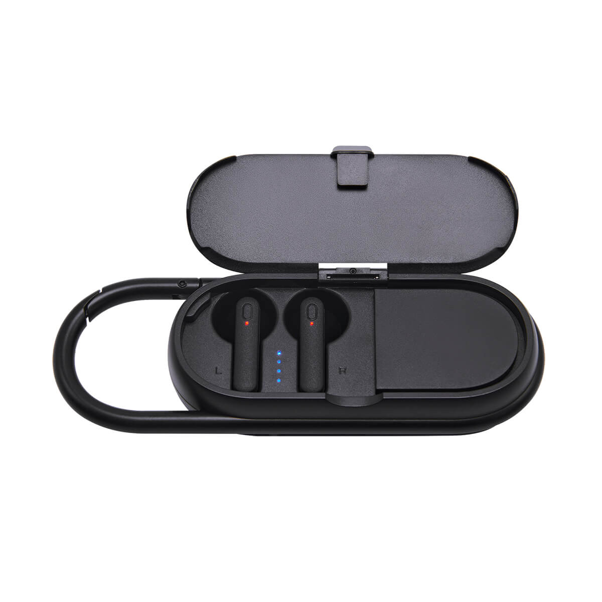 Bocina con audifonos bluetooth integrados. Pueden utilizarse ambas funciones al mismo tiempo. Controles integrados touch para volumen y reproduccion de audio. Rango de conexion 10 metros. Asa integrada tipo mosqueton para transportarla facilmente. Incluye cable cargador USB.