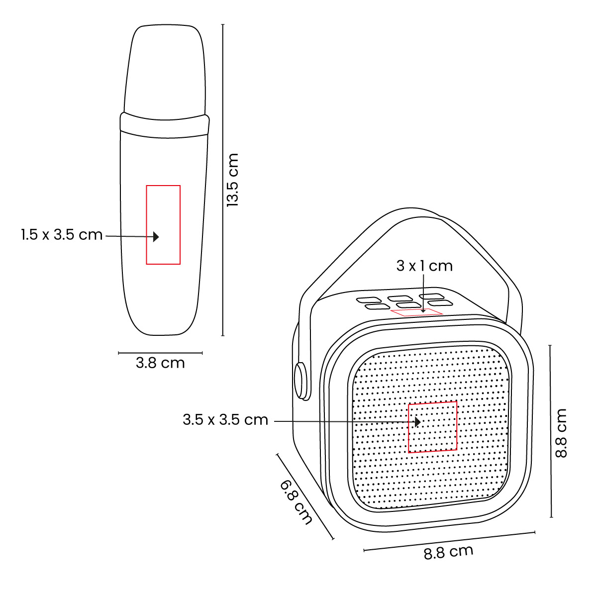Área de impresión: 3 X 1 cm Arriba / 3.5 x 3.5 cm Rejilla / 1.5 x 3.5 cm Micrófono
