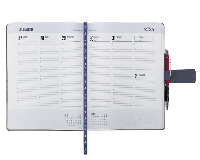 Agenda semanal de pasta rígida bicolor, de PU con cintillo magnético para cerrar y resorte para bolígrafo. Cuenta con 98 hojas (196 páginas), contenido: cuadro de dedicatoria, hoja de datos personales, calendario 2026 y días festivos, calendarios 2025 a 2029, planificador anual de gastos, planificador de proyectos (5), planificador anual, planificadores mensuales (12), agenda semanal, directorio de contactos, teléfonos de interés, hojas para notas, Mapa Red Metro CDMX, Mapa Red Metrobús CDMX, Mapa Macrobús Guadalajara, Jalisco; Mapa Transmetro Monterrey, Nvo. León, Hoja de Stickers. Incluye: Listón separador de color, impreso con el año 2026. Presentación: caja de regalo a color.