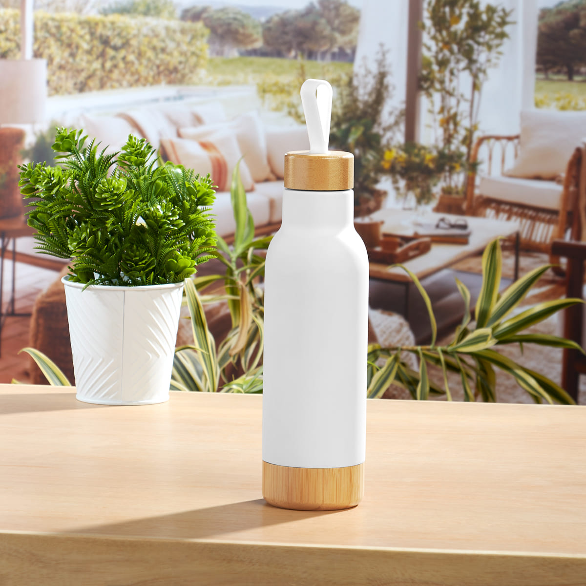Doble pared. Cerrado al vacio. Pared interna y externa de acero inoxidable. Tapa de bambú con sistema de rosca, asa de silicon y base de bambú. Mantiene temperatura caliente 6 hrs y temperatura fria 12 hrs. Incluye caja individual. El bambú es un producto natural el cual puede presentar variaciones en tonalidades y vetas.
