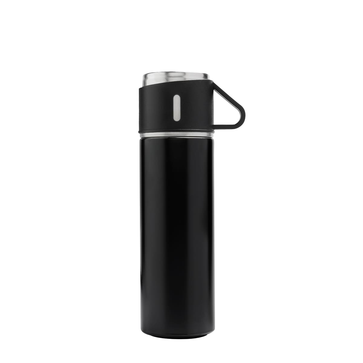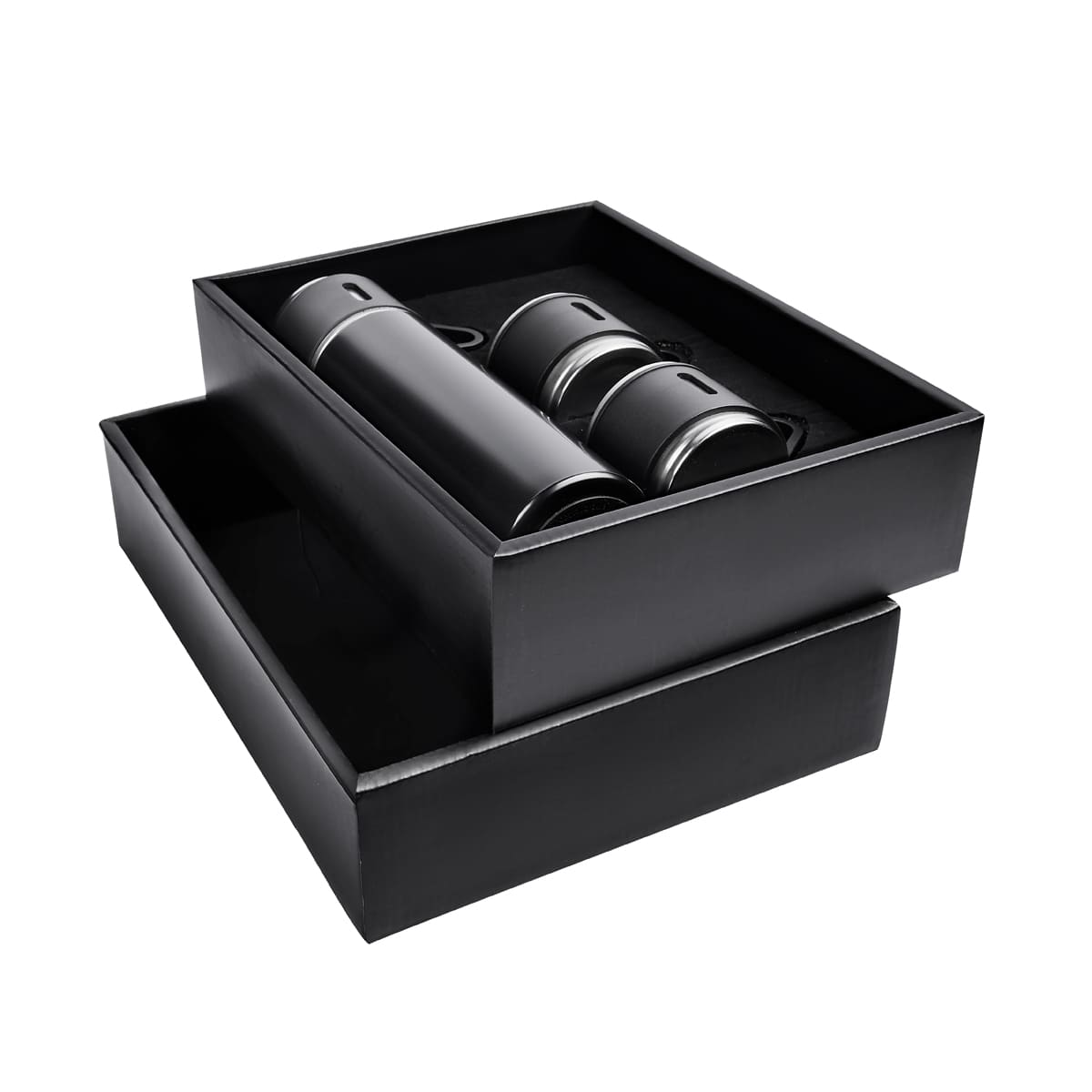 Set de regalo con 1 termo cuya tapa sirve como taza y 2 tazas adicionales. Termo doble pared cerrado al vacio, pared interna y externa de acero inoxidable, tapa interna de rosca con sistema push para verter facilmente sin retirar el tapon, mantiene temperatura caliente 6 hrs y temperatura fria 8 hrs. Las tazas de acero inoxidable con un recubrimiento y asa de plástico. Incluye Caja de regalo.