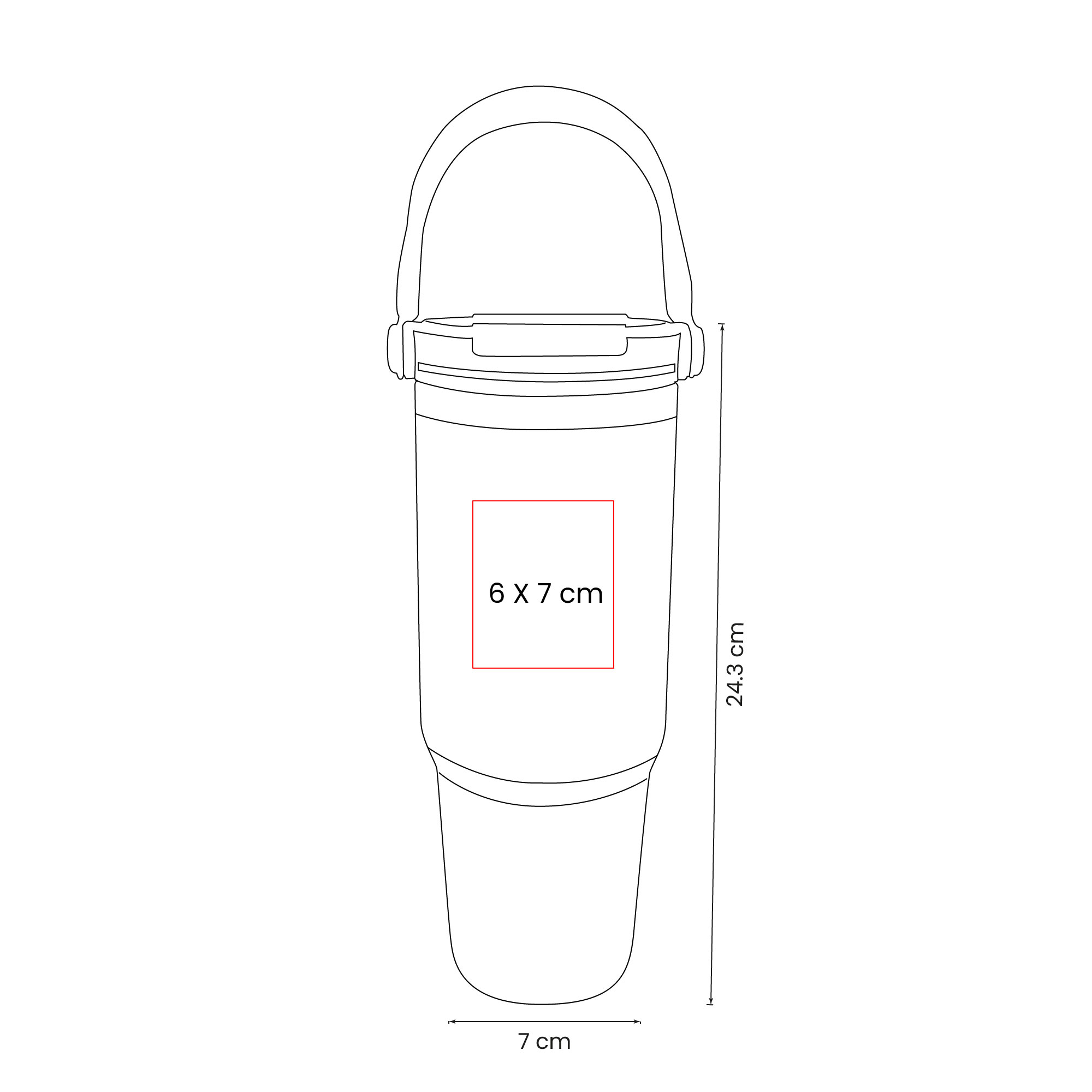 Doble pared. Cerrado al vacio. Pared interna y externa de acero inoxidable. Tapa con asa plegable de plástico con cierre de rosca. Sobretapa de push y popote retractil. Mantiene temperatura caliente 6 hrs y temperatura fria 8 hrs aproximadamente. Incluye caja individual.