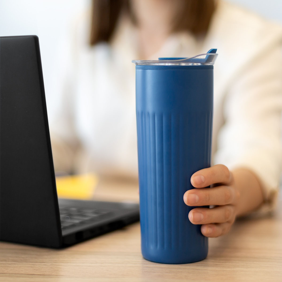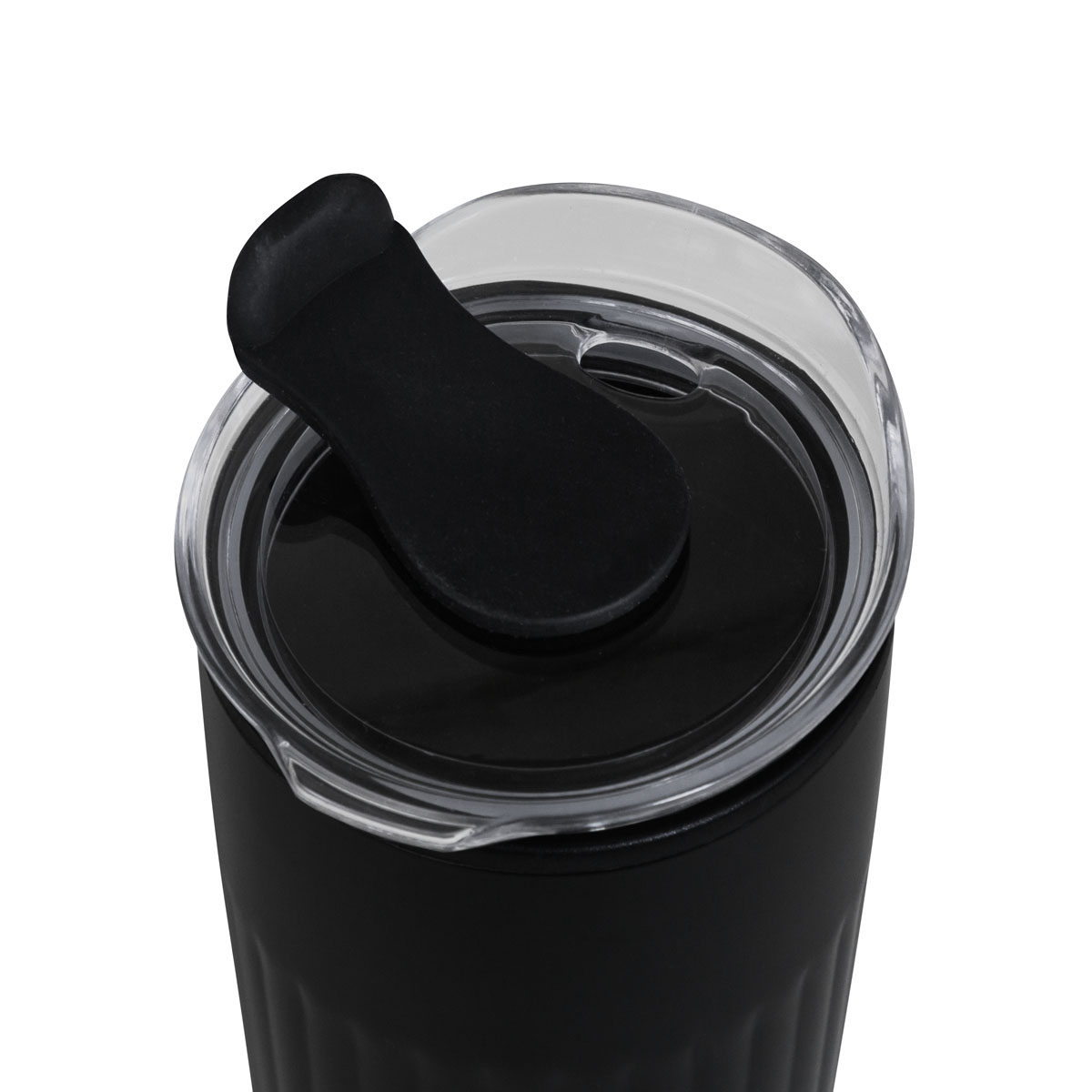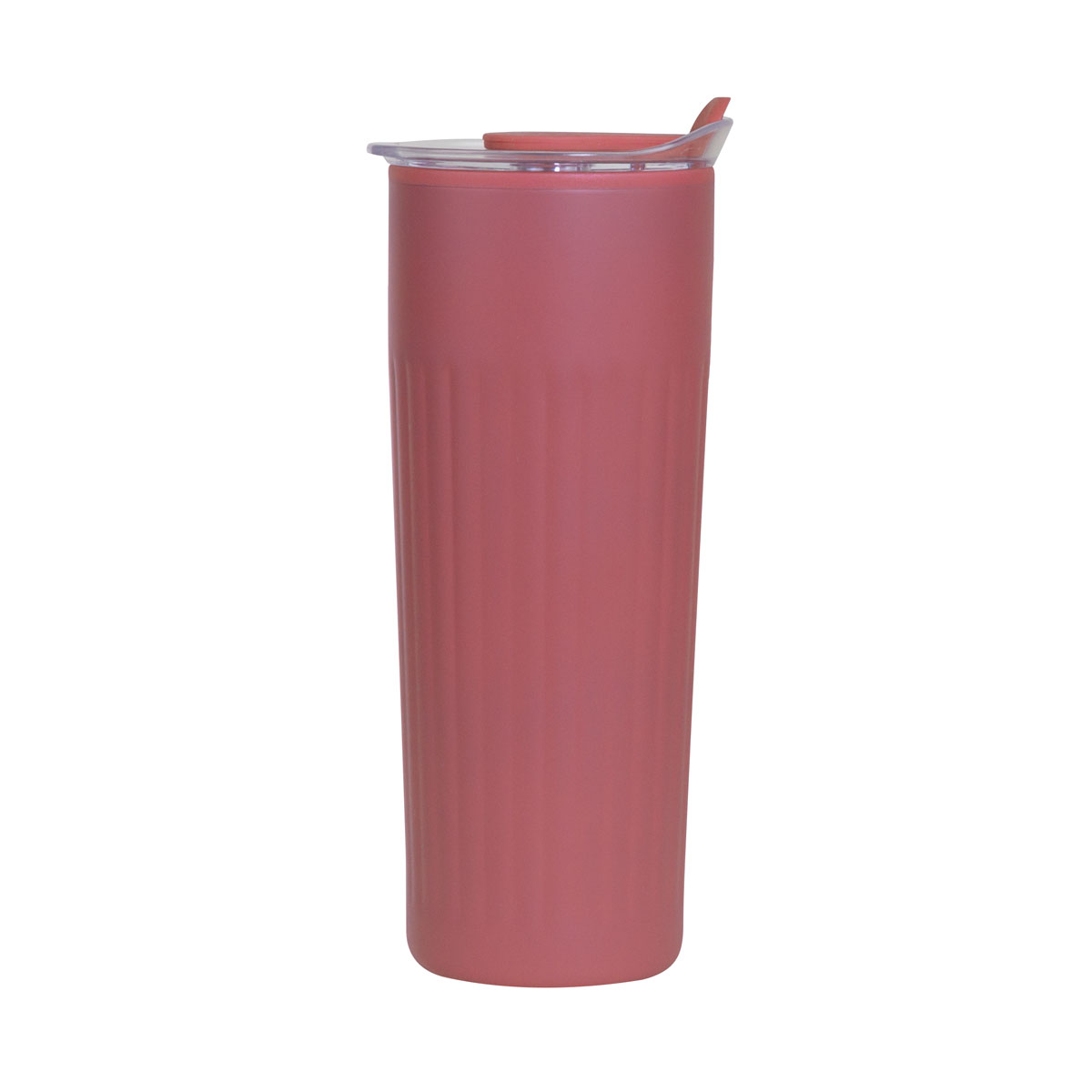 Doble pared. Pared interna de plástico, pared externa de acero inoxidable. Tapa de plástico con sistema de push. Sobre tapa de silicon movible. Incluye caja individual
