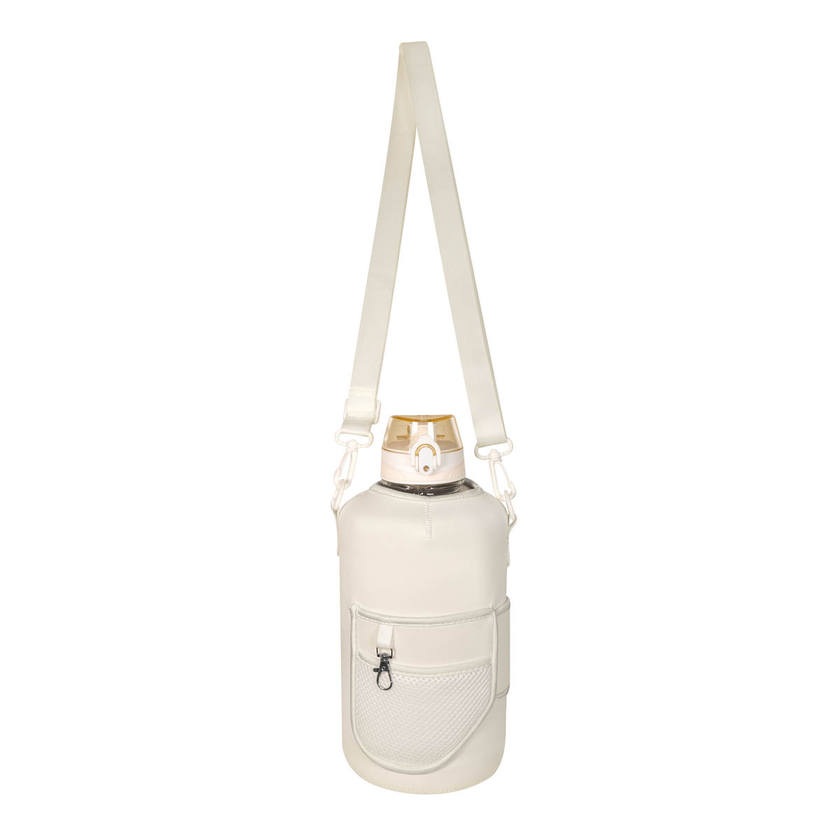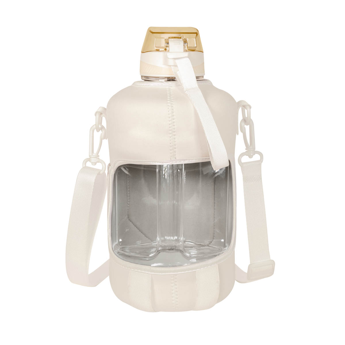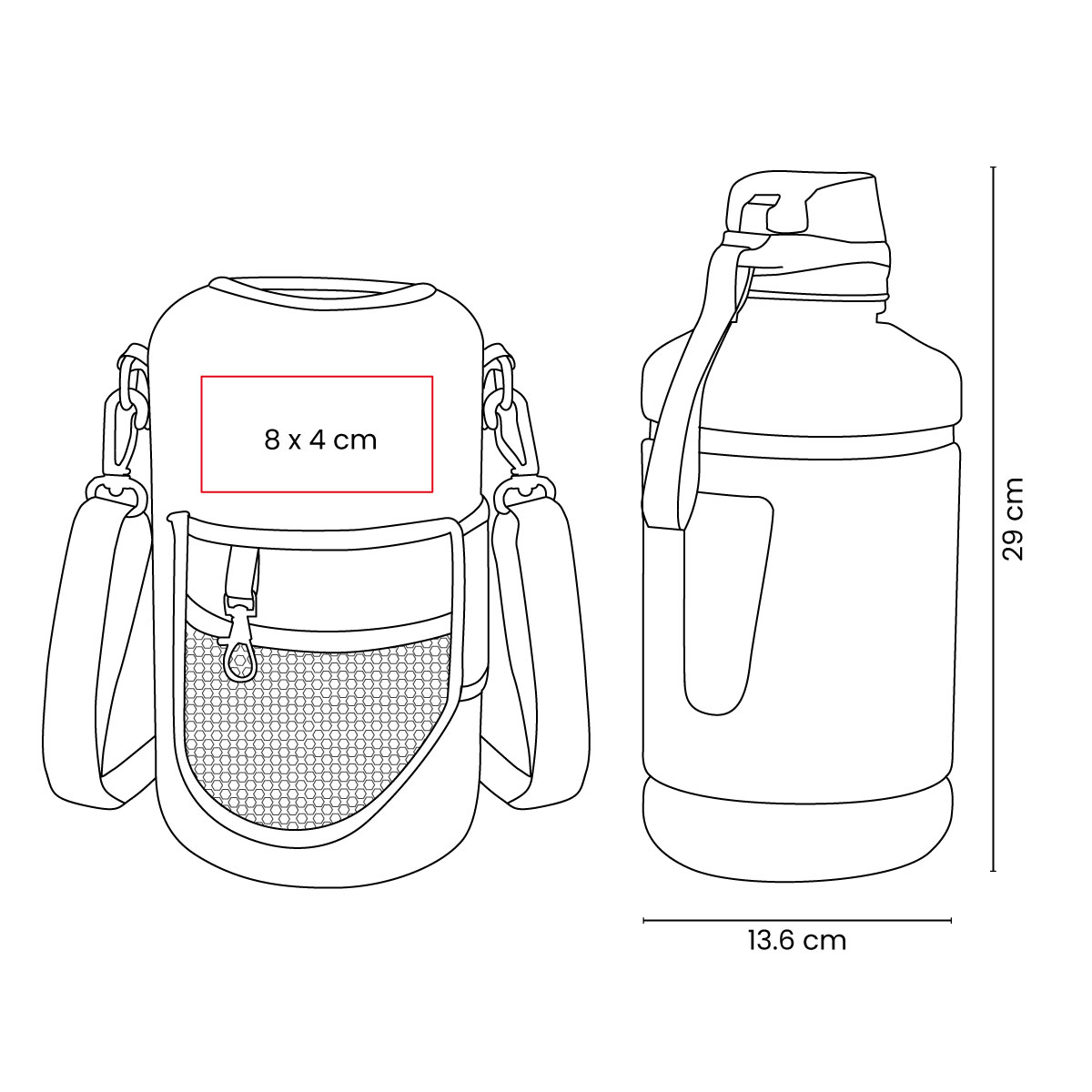 Cilindro con pared sencilla de plástico. Incluye funda removible de neopreno. Tapa de plástico con sistema de rosca y sobretapa que agrega un clip de seguridad para evitar derrames. Su tamano esta disenado para quienes necesitan llevar una gran cantidad de agua de manera practica, es perfecto para actividades intensas, largas jornadas o aventuras al aire libre, asegurando que nunca te falte agua. Los bolsillos de su funda, te permiten organizar tus articulos esenciales y no perderlos de vista mientras te ejercitas y su correa ajustable lo hace ideal para llevarlo contigo sin mayor esfuerzo.