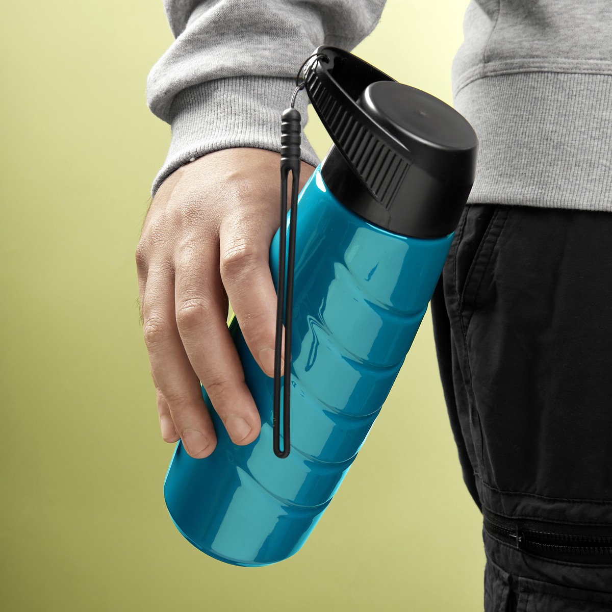 Cilindro deportivo de una pared. Tapa de plástico con sistema de rosca, incluye un asa de silicon para transportarla facilmente. Su diseno ergonomico no solo facilita el agarre, sino que tambien se adapta comodamente a tu mano, permitiendote enfocarte en tu rendimiento sin distracciones. Ideal para el gimnasio, entrenamiento o cualquier actividad al aire libre.