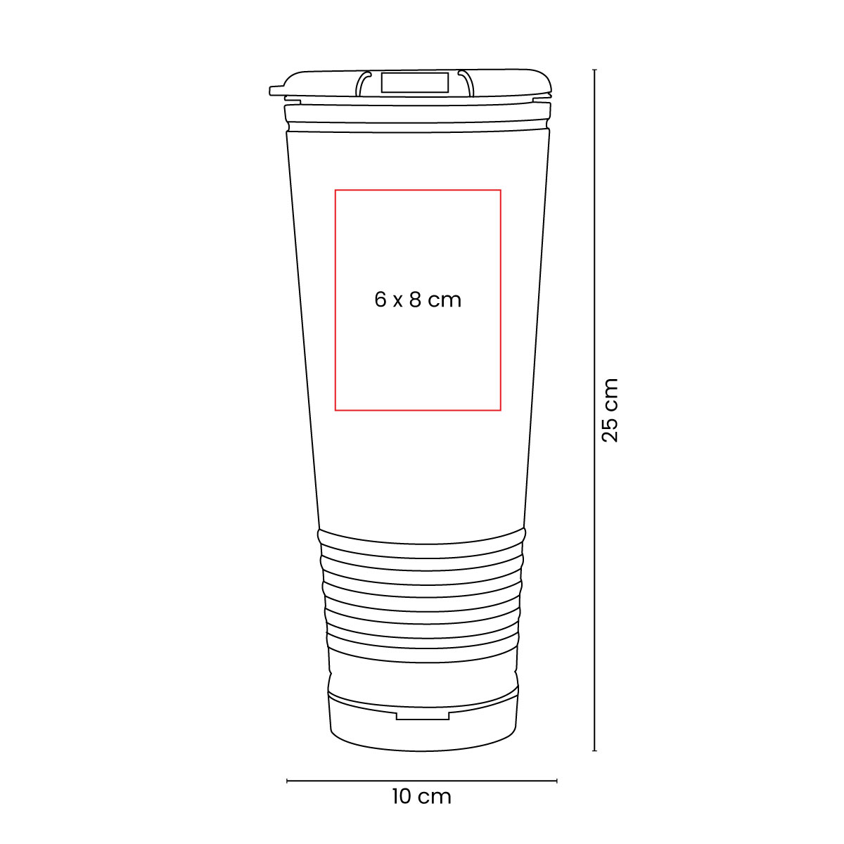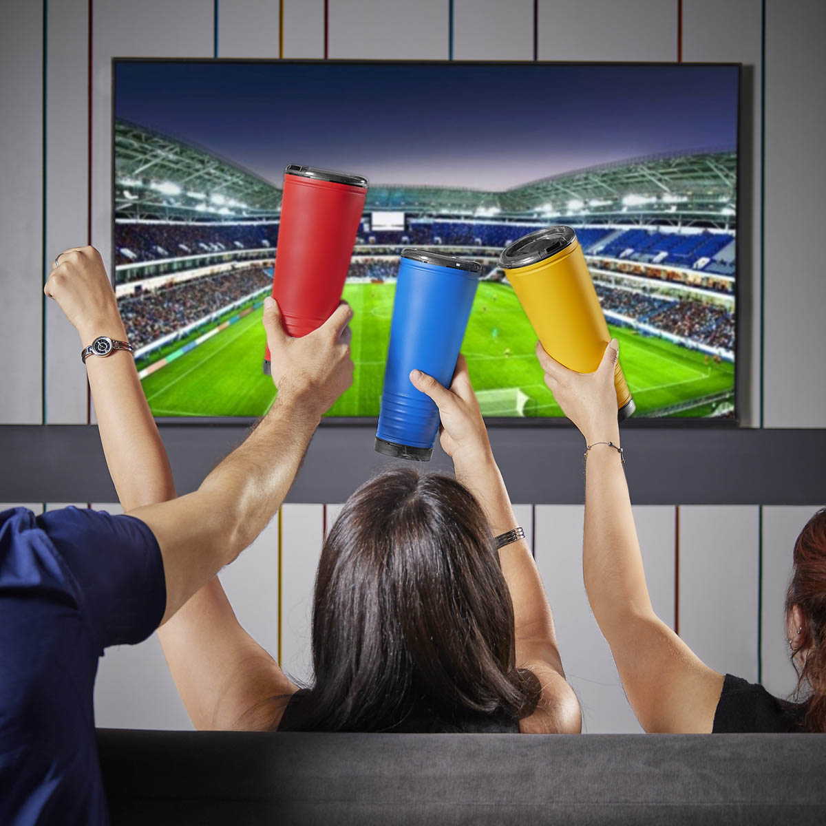 ¡Lleva la emocion de los eventos deportivos al siguiente nivel! Termo equipado con una boquilla especial en la tapa que realiza una doble funcion; como trompeta, para animar tu evento favorito y al mismo tiempo, disfrutar de tu bebida preferida. Termo doble pared. Pared interna de plástico y externa de acero inoxidable. Tapa de plástico con sistema push y valvula de seguridad. Capacidad de 24 Oz. Base de 7 cm de diametro. Incluye caja individual.