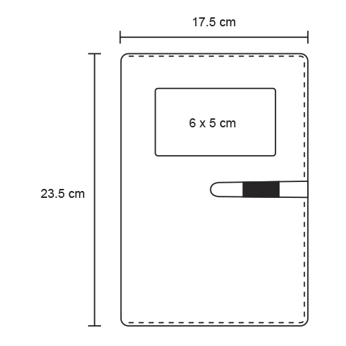 Carpeta de poliéster con block de 100 hojas rayadas, compartimiento para tarjetas, porta bolígrafo, cierre magnético, batería y cables.