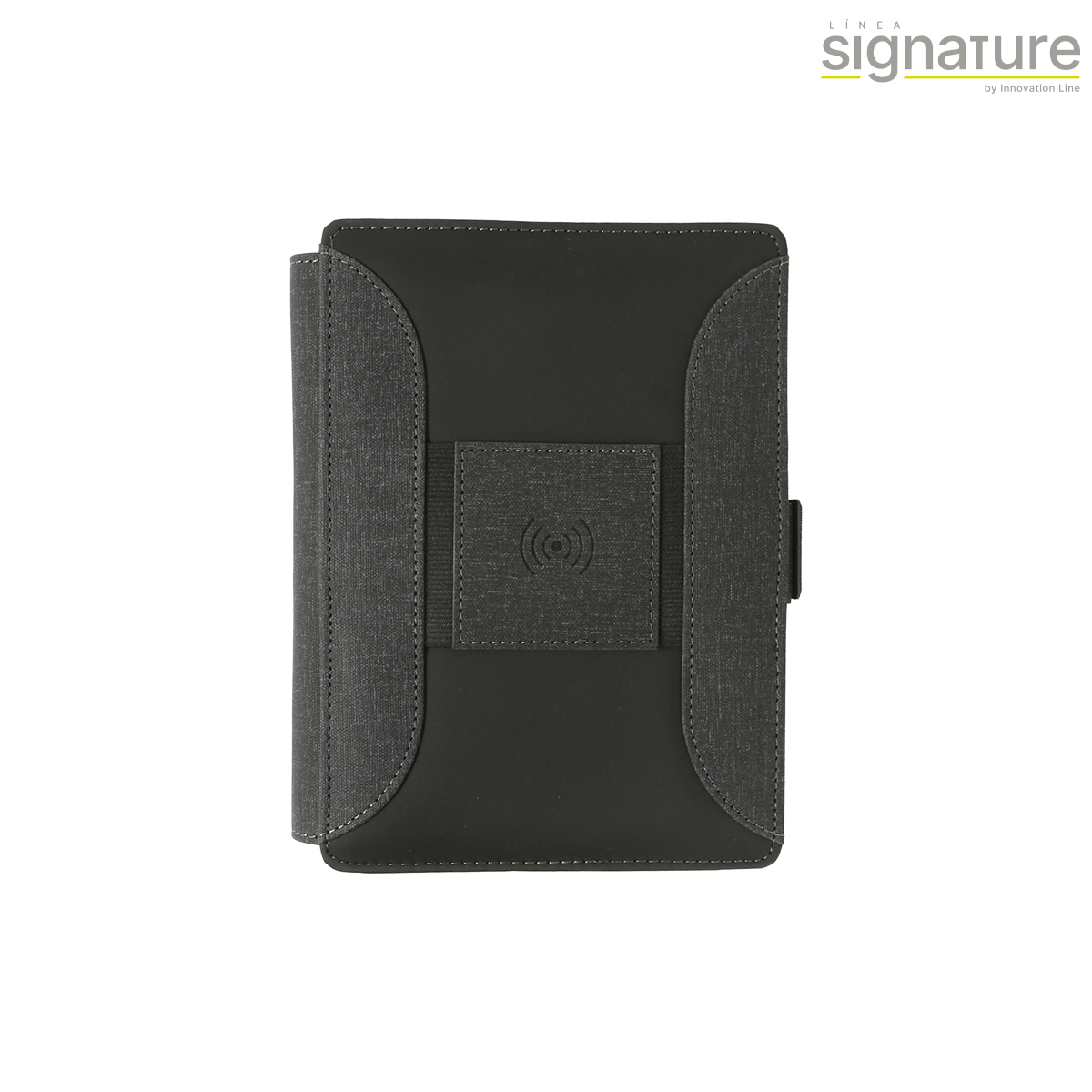 Carpeta con cargador inalámbrico y power bank de 6,000 mAh, con compartimentos para almacenaje, porta plumas y tarjetero, sujetadores de cables y base para teléfono móvil. Libreta con hojas rayadas y broches de seguridad.