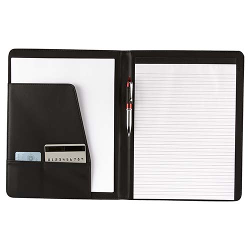 Incluye block de raya tamano A4 con 20 hojas, elastico para boligrafo, compartimento para documentos y tarjetas. No incluye boligrafo.