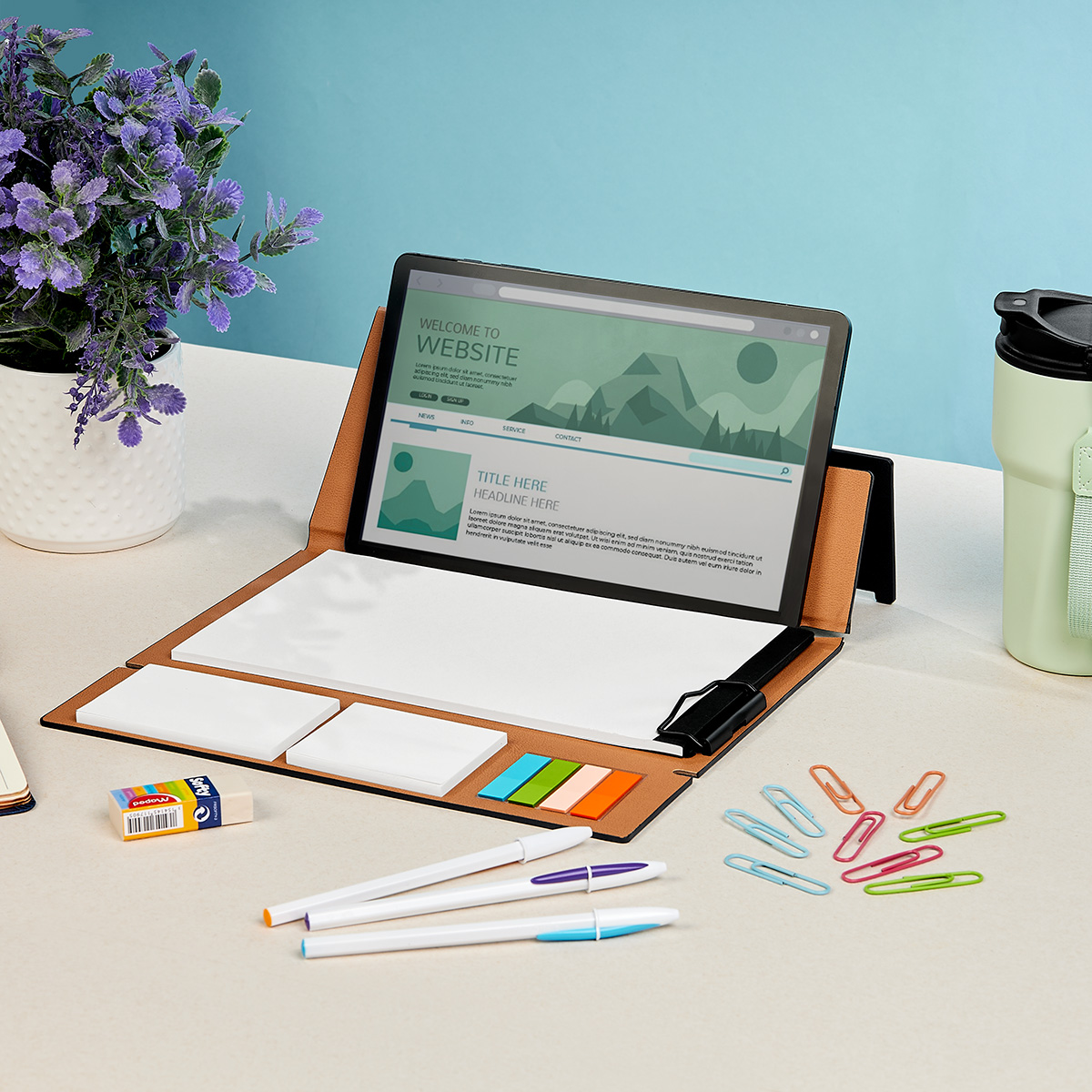 Carpeta planeador con cubierta rigida. Sus hojas blancas ofrecen un lienzo para dibujar, esbozar y escribir. Su diseno plegable la convierte en un practico soporte para tablet o smartphone. En su interior, cuenta con un block de 40 hojas, dos blocks de 50 notas adhesivas y 4 colores diferentes de banderines, cada uno con 25 piezas. Su clip metalico mantiene el block en su lugar y te permitira reusarla, una vez que se agoten sus hojas.
