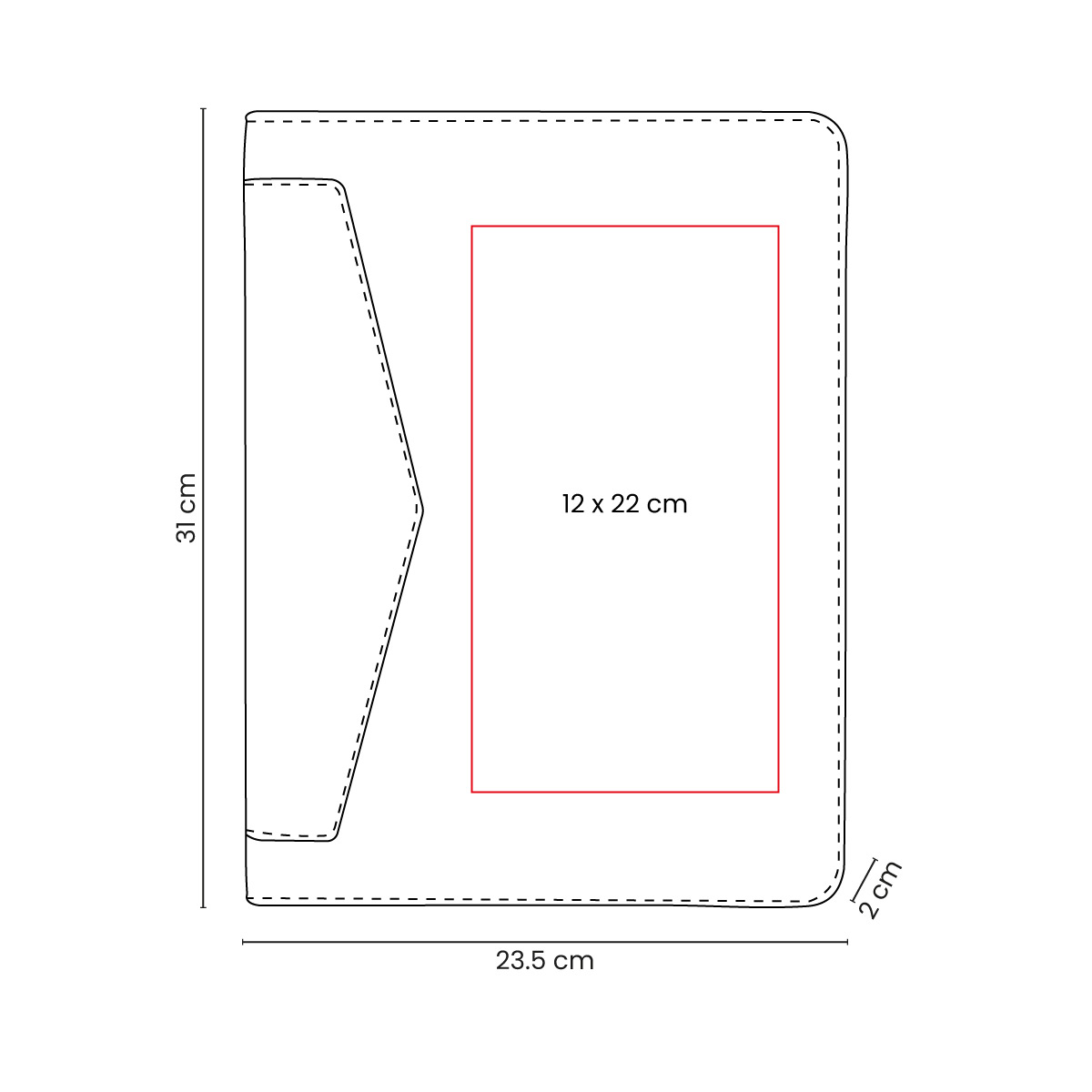 CARPETA CON COMPARTIMENTOS PARA HOJAS Y TARJETAS. INCLUYE UN BLOCK DE RAYA TAMAÑO A4 CON 20 HOJAS Y UN ELASTICO PARA SUJETAR UN BOLIGRAFO. NO INCLUYE BOLIGRAFO.