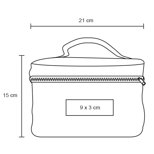 Cosmetiquera de poliéster en forma rectangular con dos compartimientos y asa.
