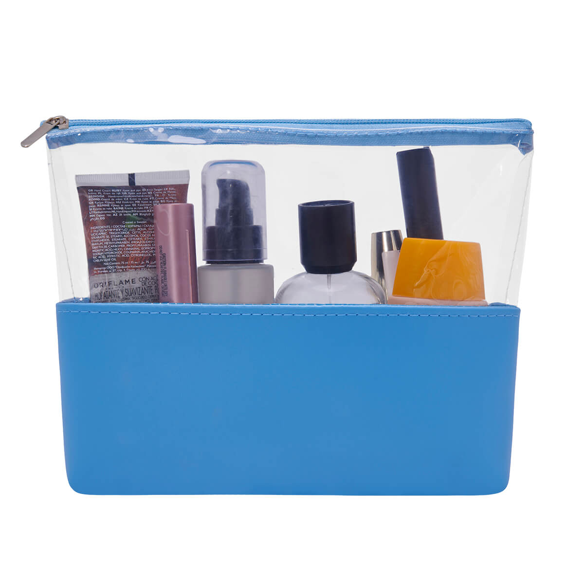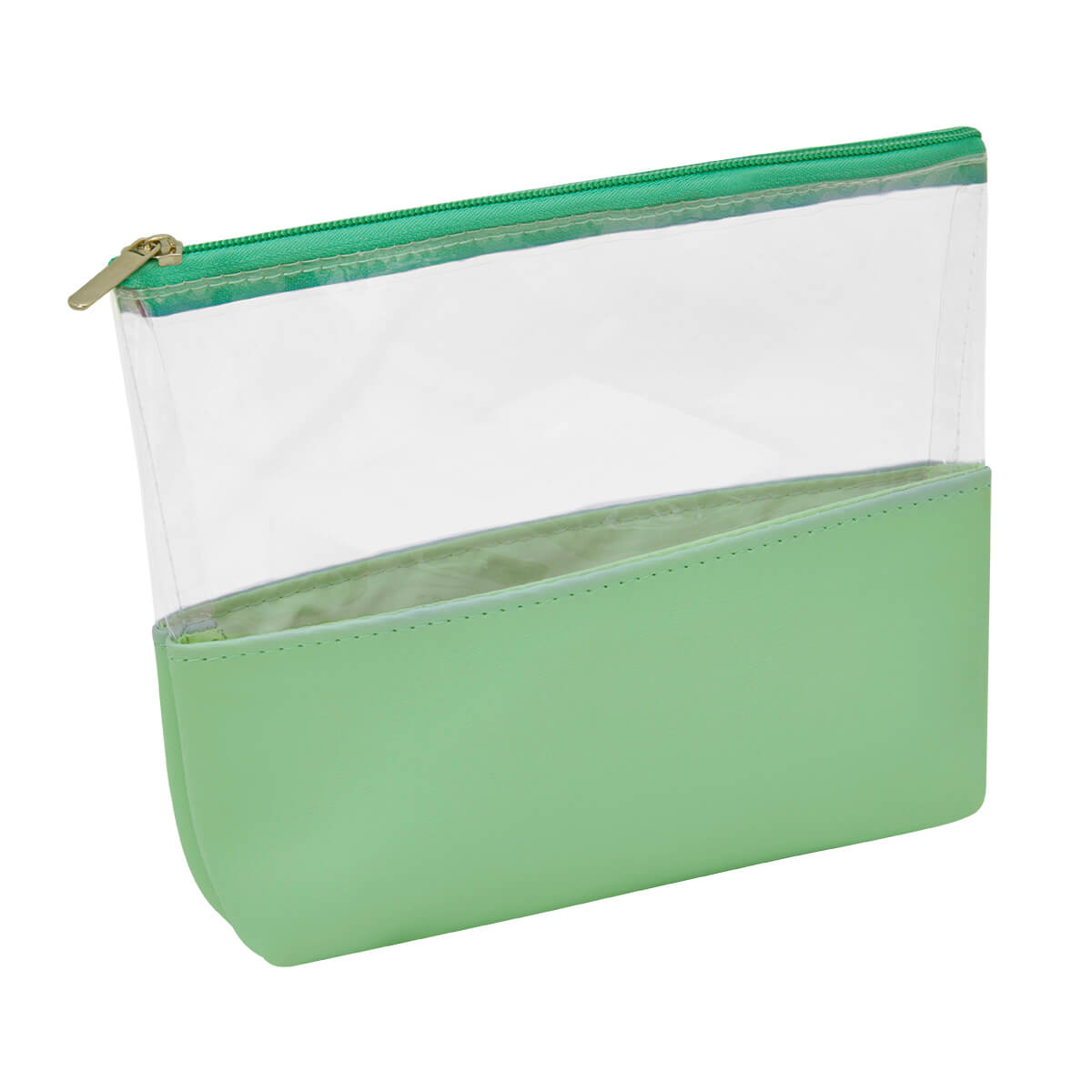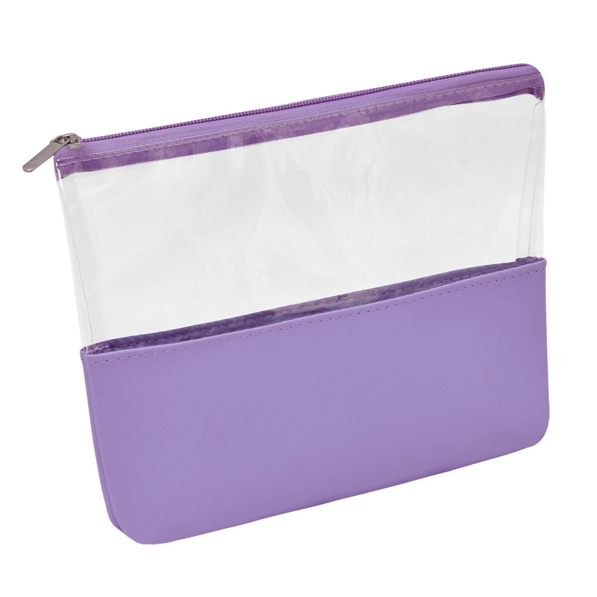 Cosmetiquera con cierre. Diseno combinado de PVC transparente y curpiel de color en base.
