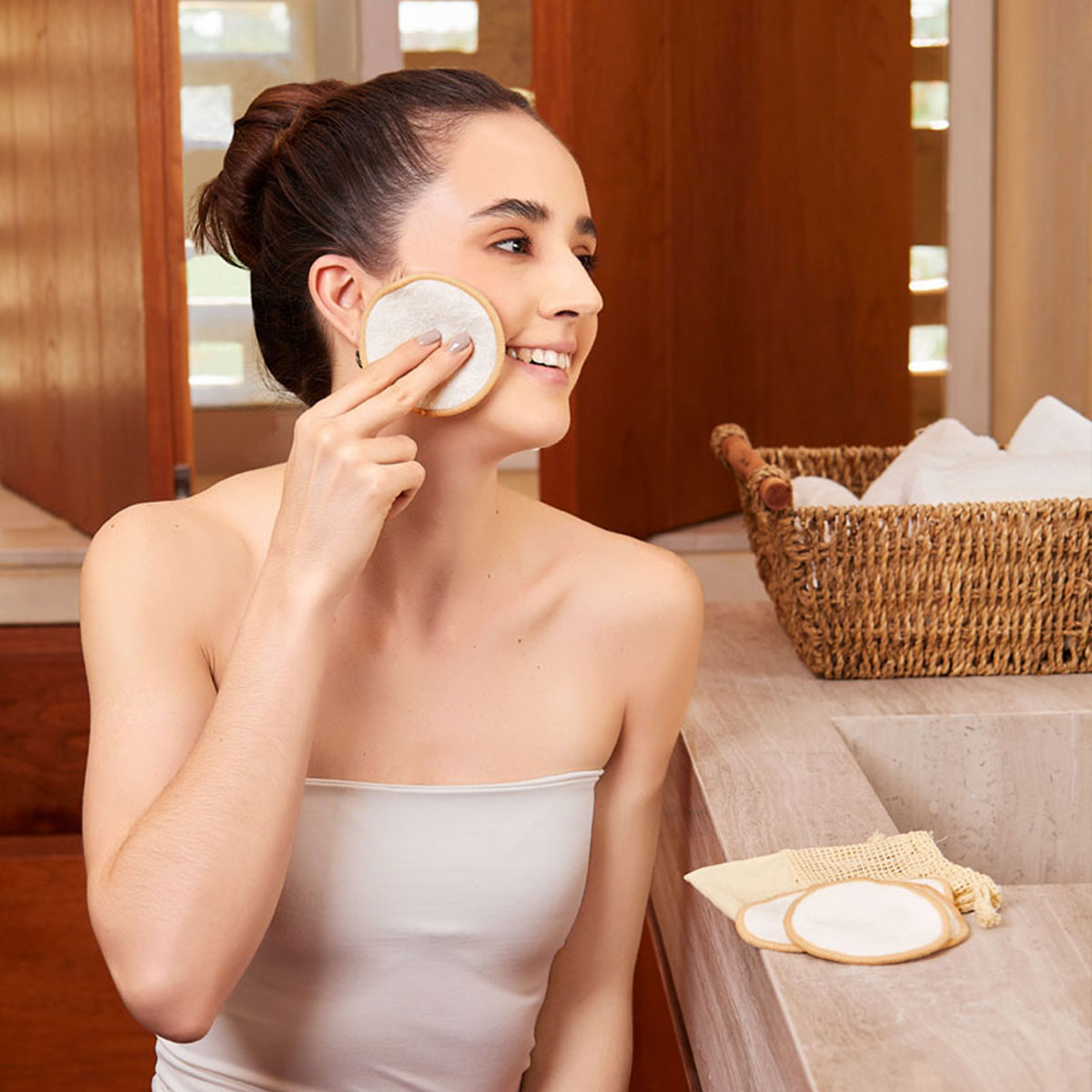 Set de 5 almohadillas desmaquillantes y reutilizables. Gracias a su material de fibra de bambú, son suaves para utilizar en tu piel. Incluye bolsa de algodon con cierre de jareta.