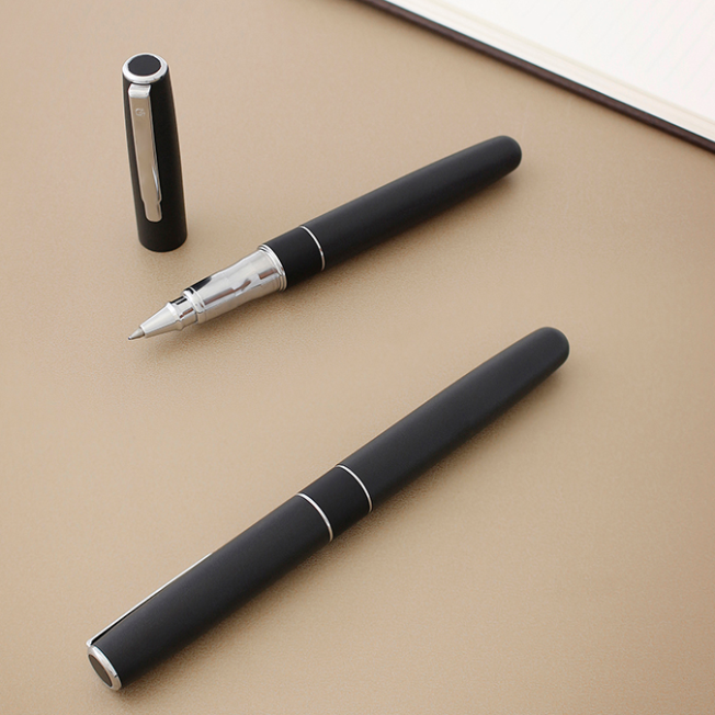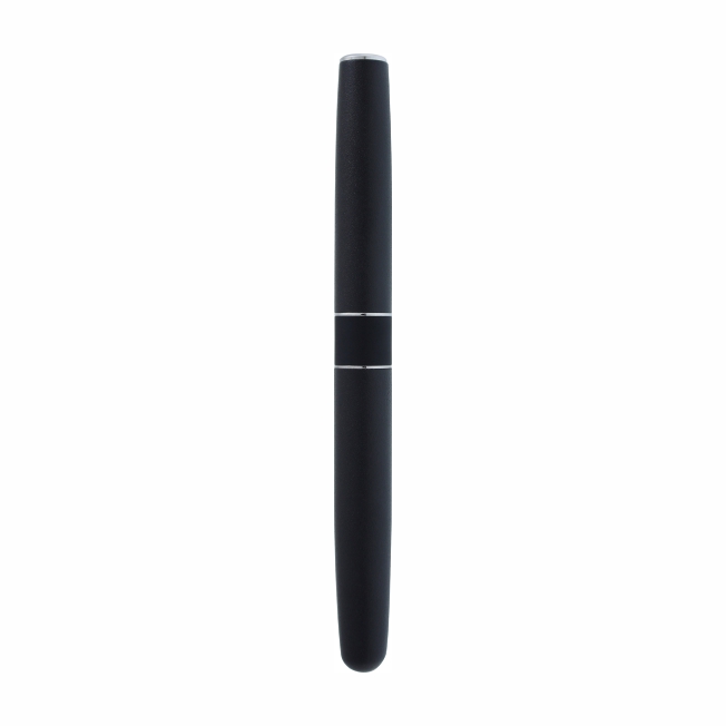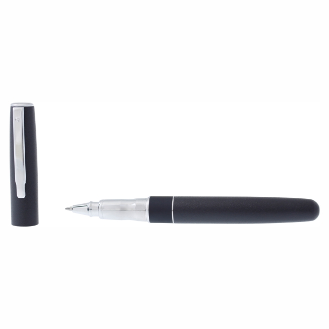 Bolígrafo metálico con tapón que cierra a presión. Detalles color cromo. Acabado negro mate con textura tipo roca que permite grabados de mayor profundidad. Escritura de alto desempeño debido a su repuesto japonés tipo roller (a elegir entre tinta negra o azul). Incluye estuche individual.