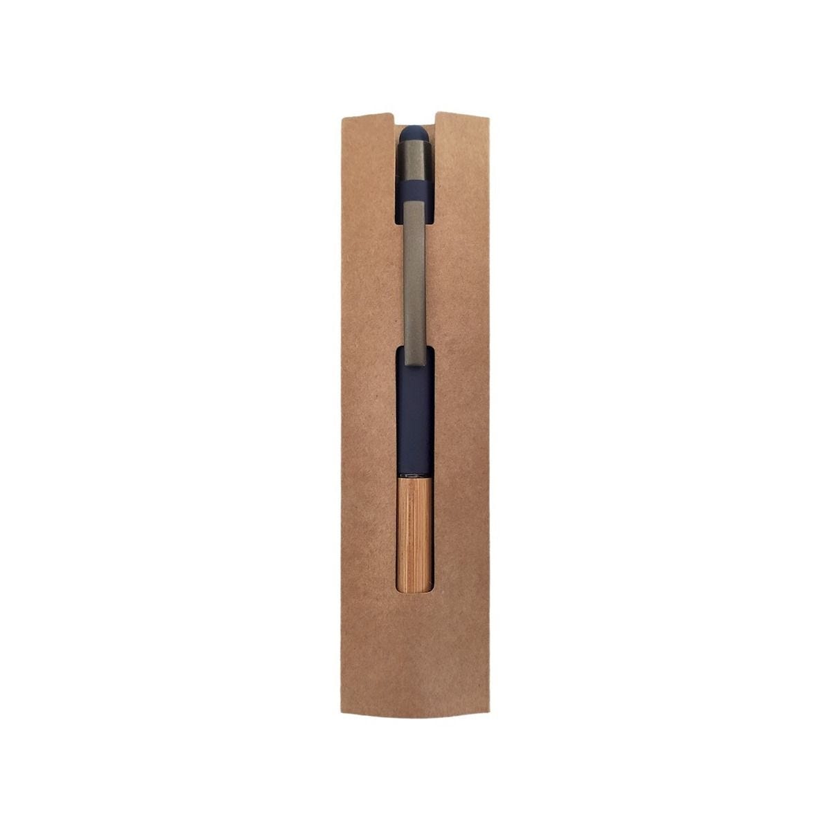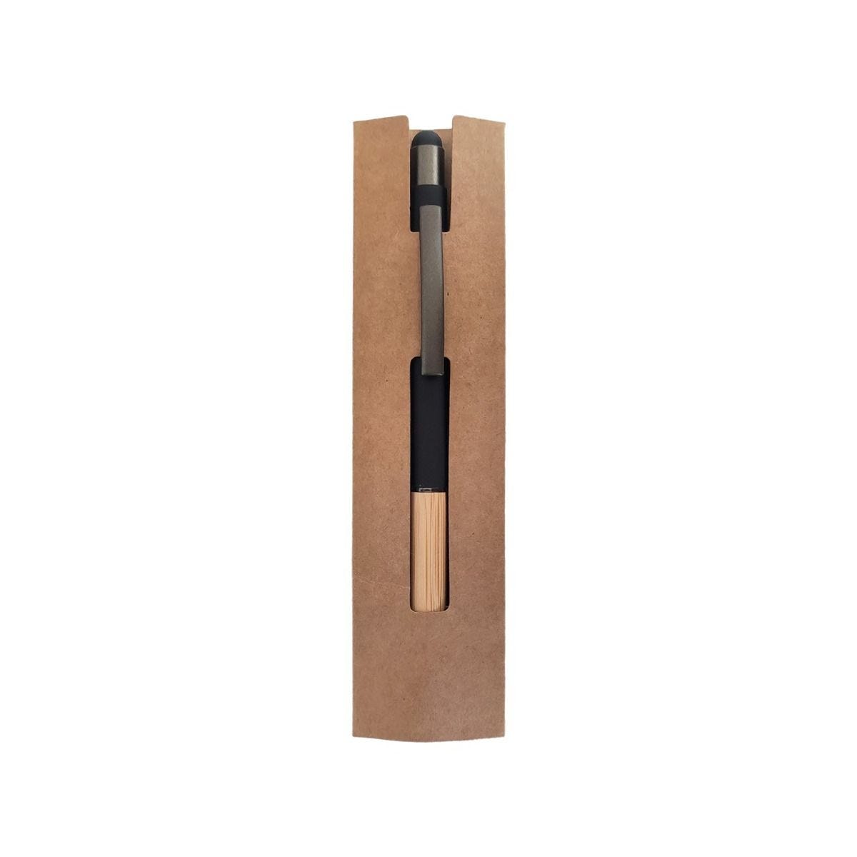 Boligrafo con touch screen y grip de bambú. Terminado rubber. Mecanismo pulsador. Incluye funda.