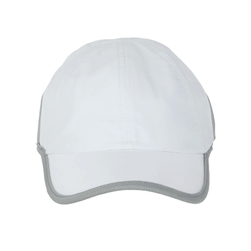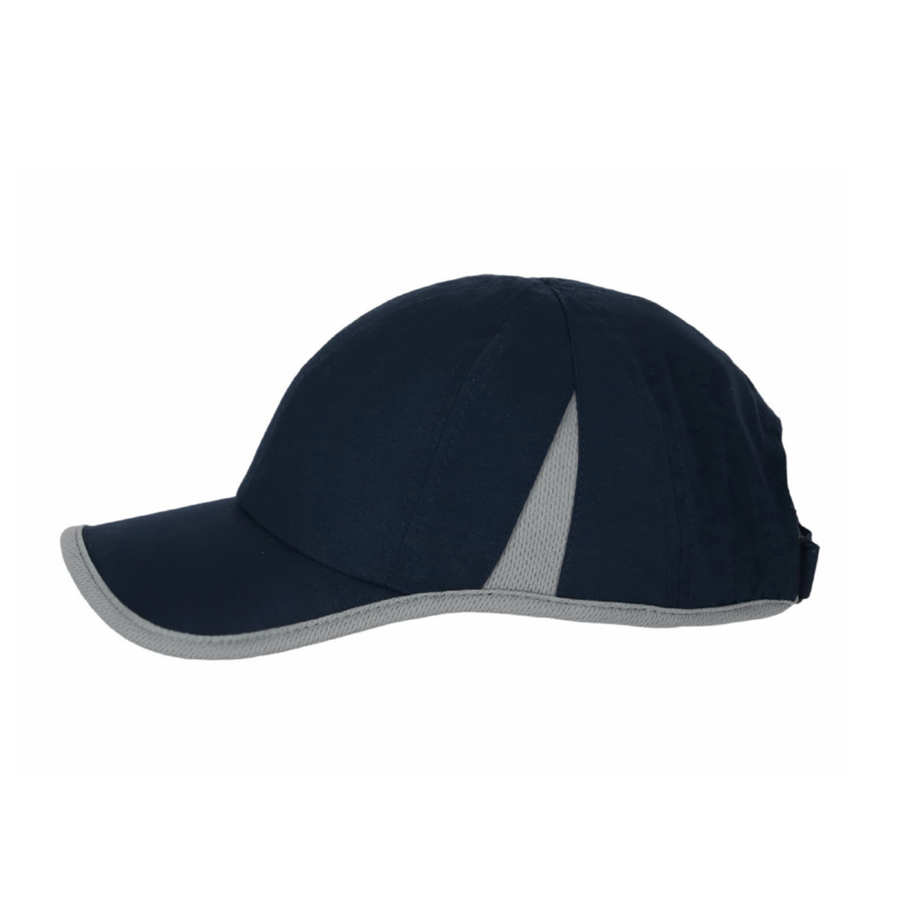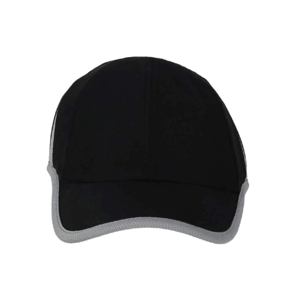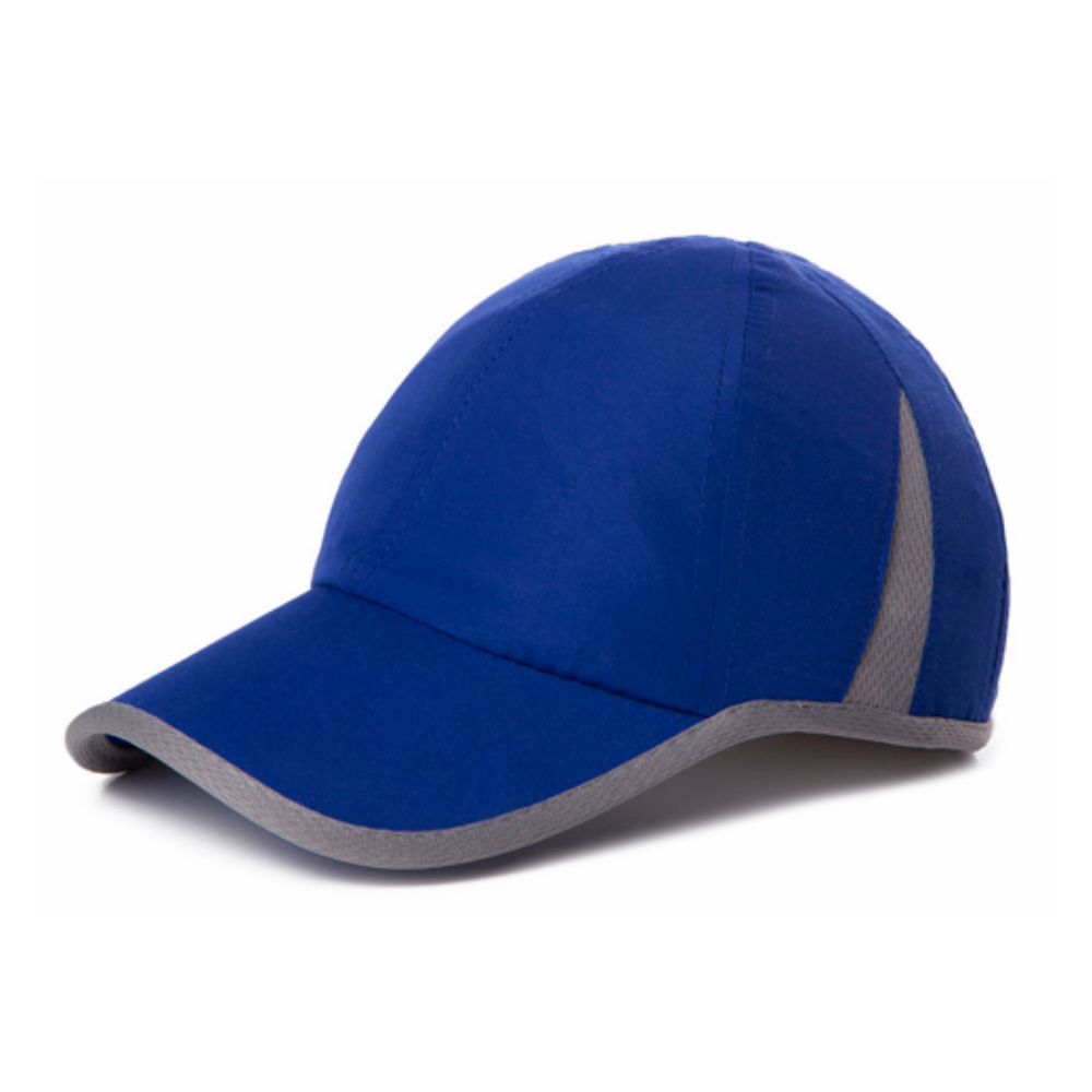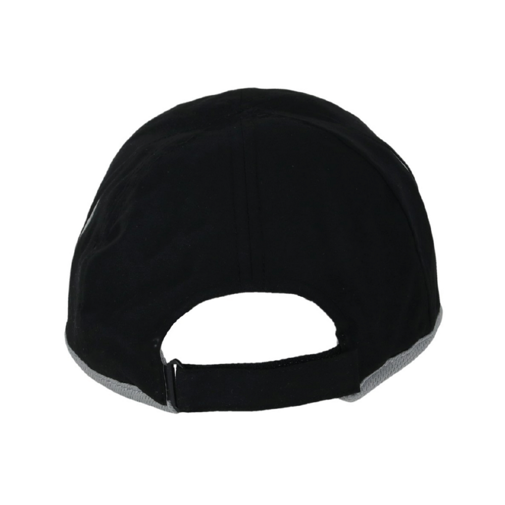 GORRA 100% MICROFIBRA DE poliéster CON AJUSTE CORREDIZO DE CINTURON, RESPIRADORES LATERALES, BANDA ABSORBENTE INTERIOR, FILO GRIS EN LOS COSTADOS, 6 GAJOS, VISERA CURVA.