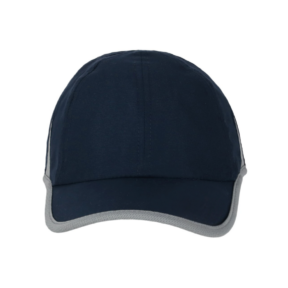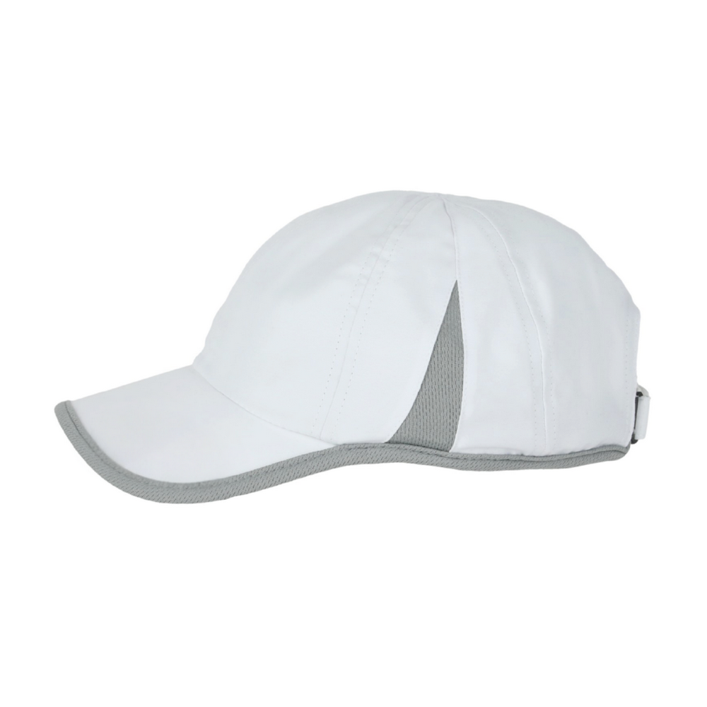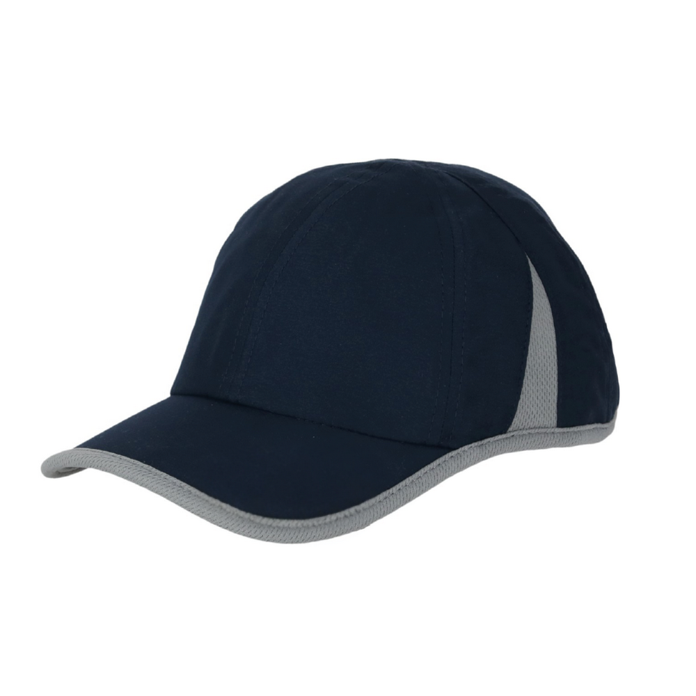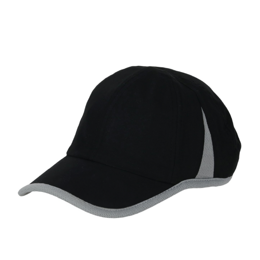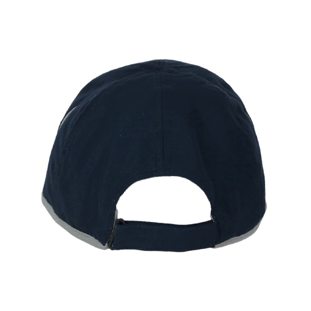 GORRA 100% MICROFIBRA DE poliéster CON AJUSTE CORREDIZO DE CINTURON, RESPIRADORES LATERALES, BANDA ABSORBENTE INTERIOR, FILO GRIS EN LOS COSTADOS, 6 GAJOS, VISERA CURVA.