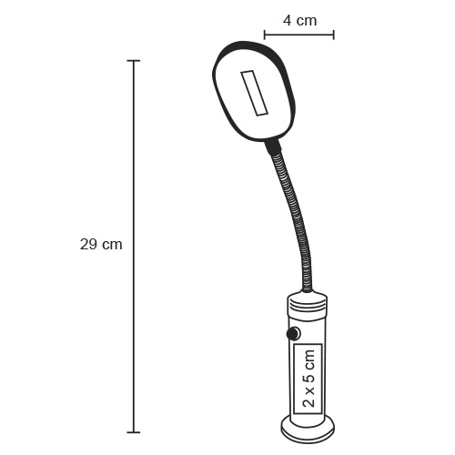Lámpara portátil metálica con luz LED que enciende con 3 baterías AAA (no incluidas), botón de encendido de click, soporte flexible e imán en la parte inferior.