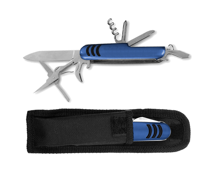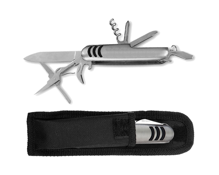 Navaja multifuncional. Incluye: desarmador de cruz, destapador, abrelatas, tijeras, sacacorchos y arillo para llavero. Incluye funda. Presentación: caja en color plata.