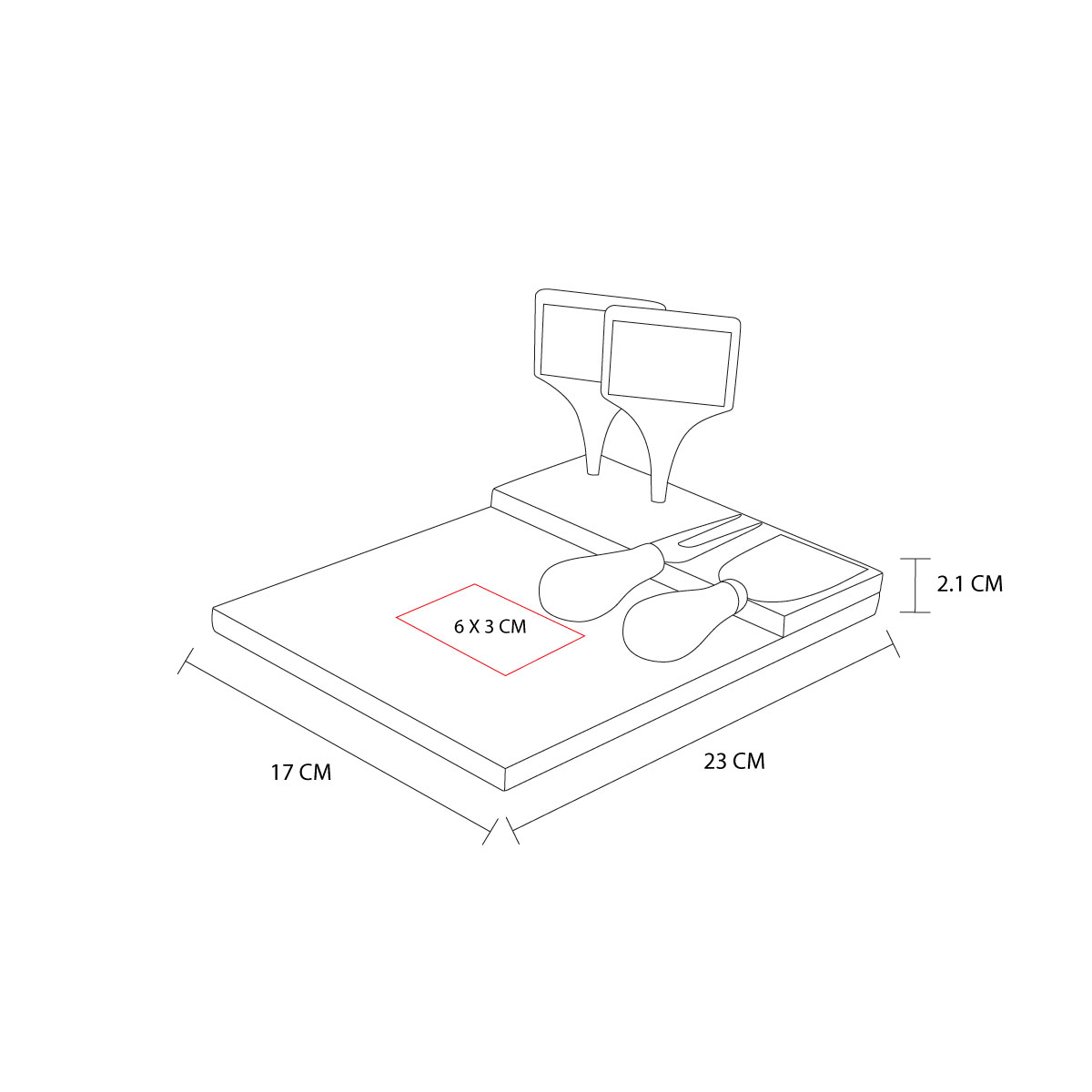 Set con 1 tabla de marmol con bambú. Incluye cuchillo y tenedor para quesos, dos banderines para escribir y un gis en color blanco. Incluye caja individual. La madera es un producto natural el cual puede presentar variaciones en tonalidades y vetas.