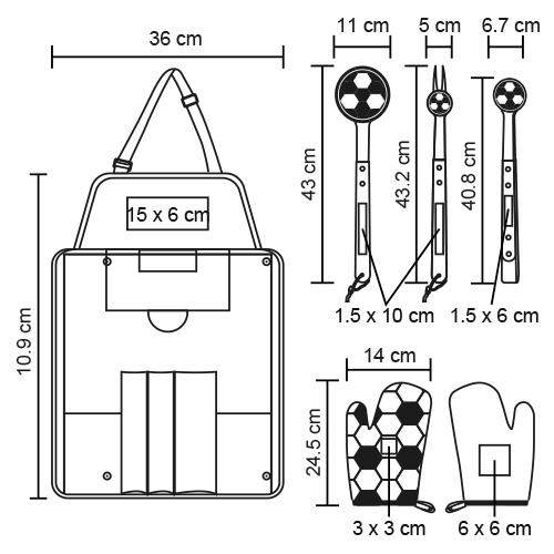SET DE BBQ EN ESTUCHE CON DISEÑO DE CANCHA DE FÚTBOL QUE TAMBIEN FUNCIONA COMO MANDIL. INCLUYE GUANTE, PINZAS, TENEDOR ASADOR Y VOLTEADOR.