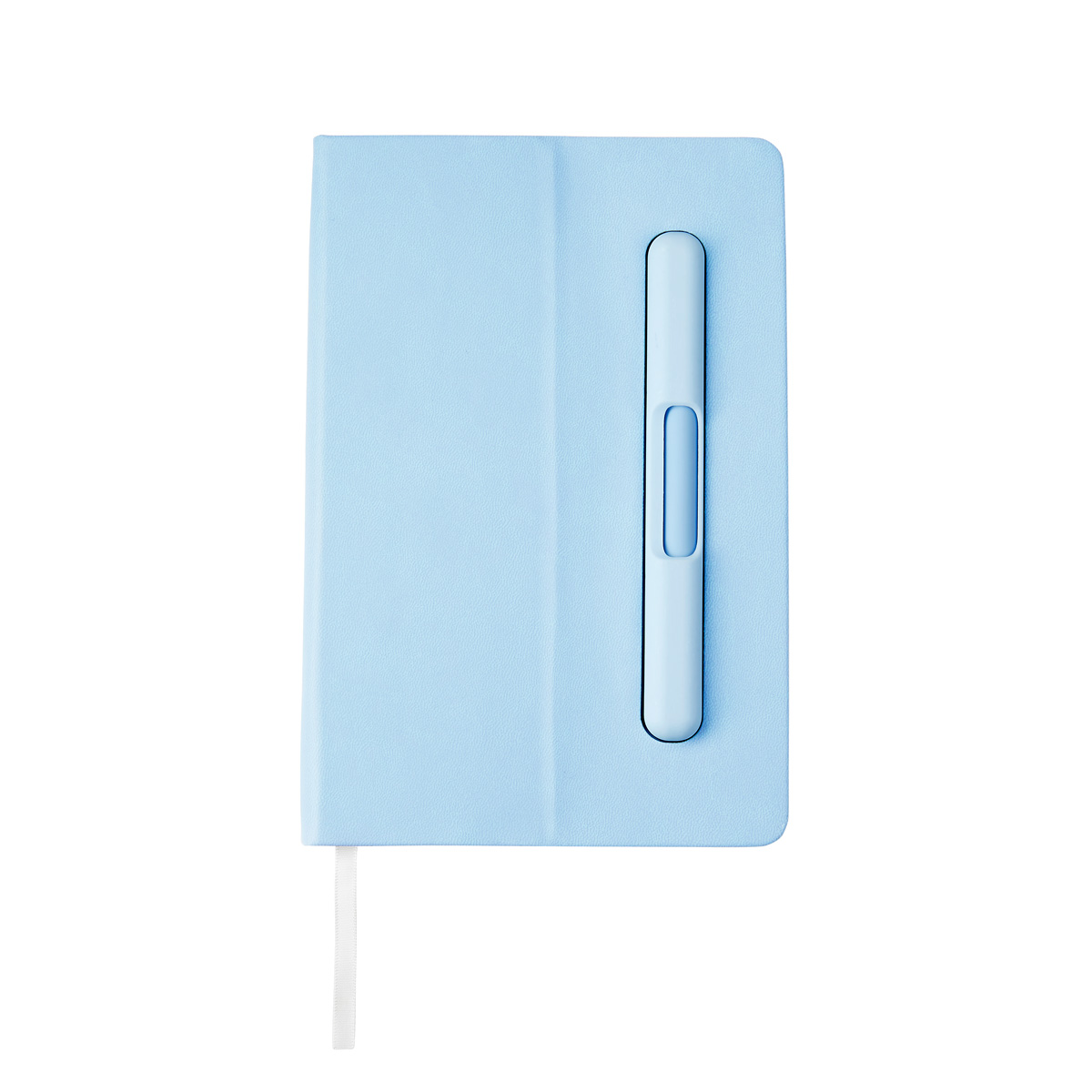Libreta con 96 hojas a raya. Pasta plegable que funciona como base para smartphone. Cubierta rigida de curpiel que incluye un boligrafo desmontable y liston separador de hojas. Con este practico set, estaras siempre listo para plasmar tus ideas en cualquier momento.
