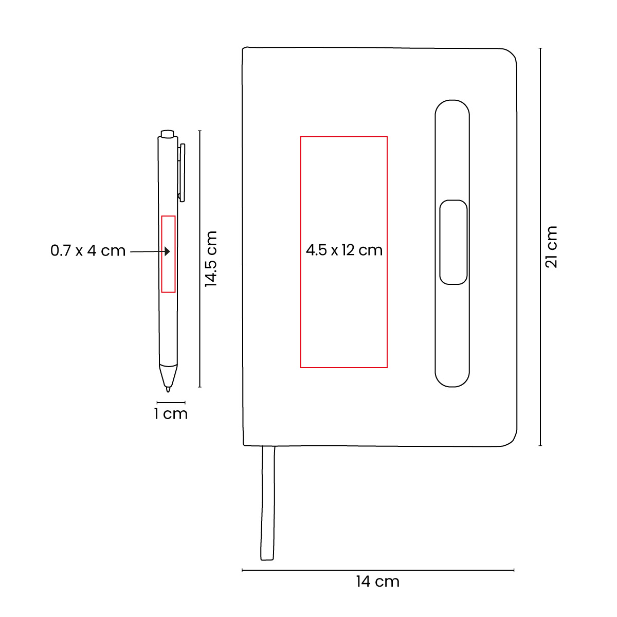 Área de impresión: 4.5 x 12 cm Libreta / 0.7 x 4 cm Bolígrafo