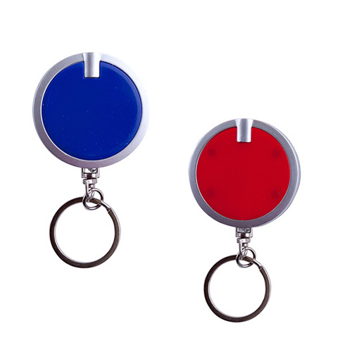 Llavero de plástico circular con luz LED blanca. Incluye baterías.