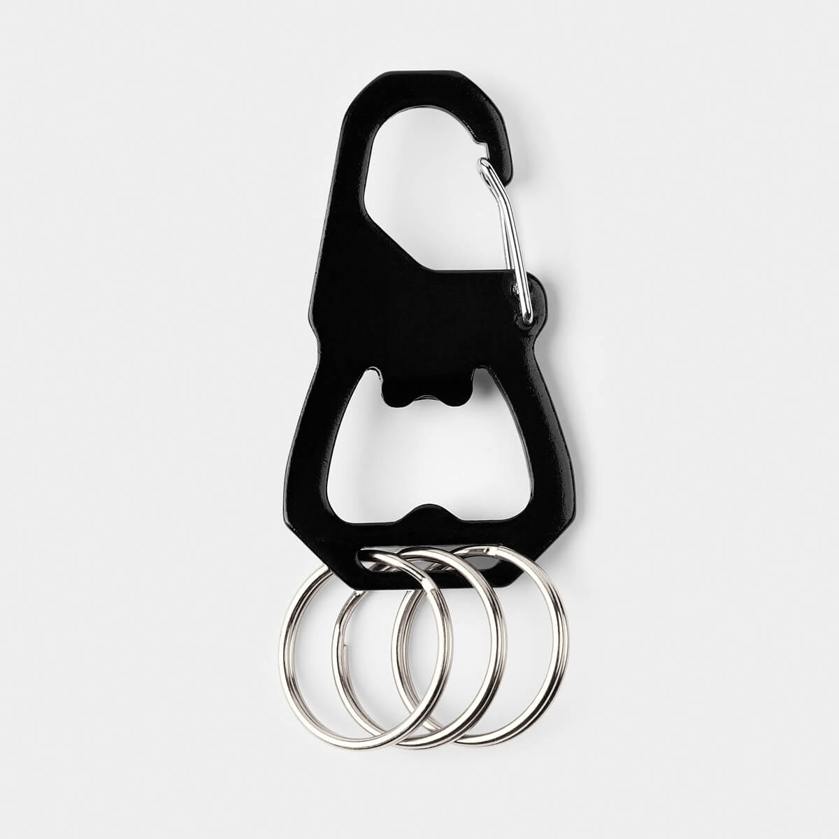 Llavero metalico multifuncion con gancho, destapador y tres aros para llaves. Organiza y transporta tus llaves con un accesorio practico y de uso diario.