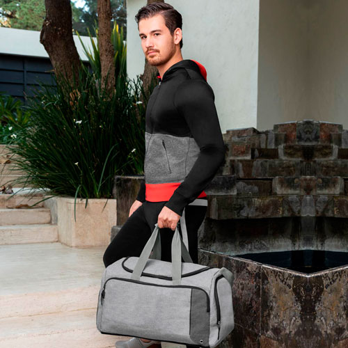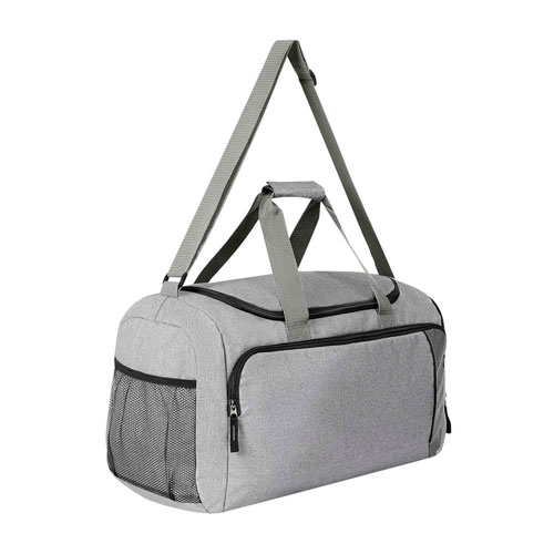 Bolsa principal y frontal con cierre. Incluye bolsa lateral de red, bolsa lateral con cierre, asas y correa para hombro ajustable.