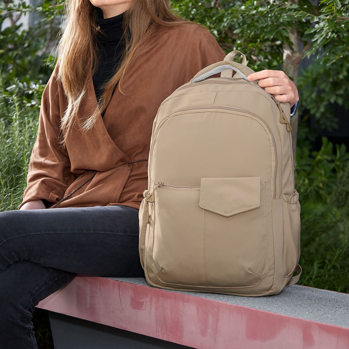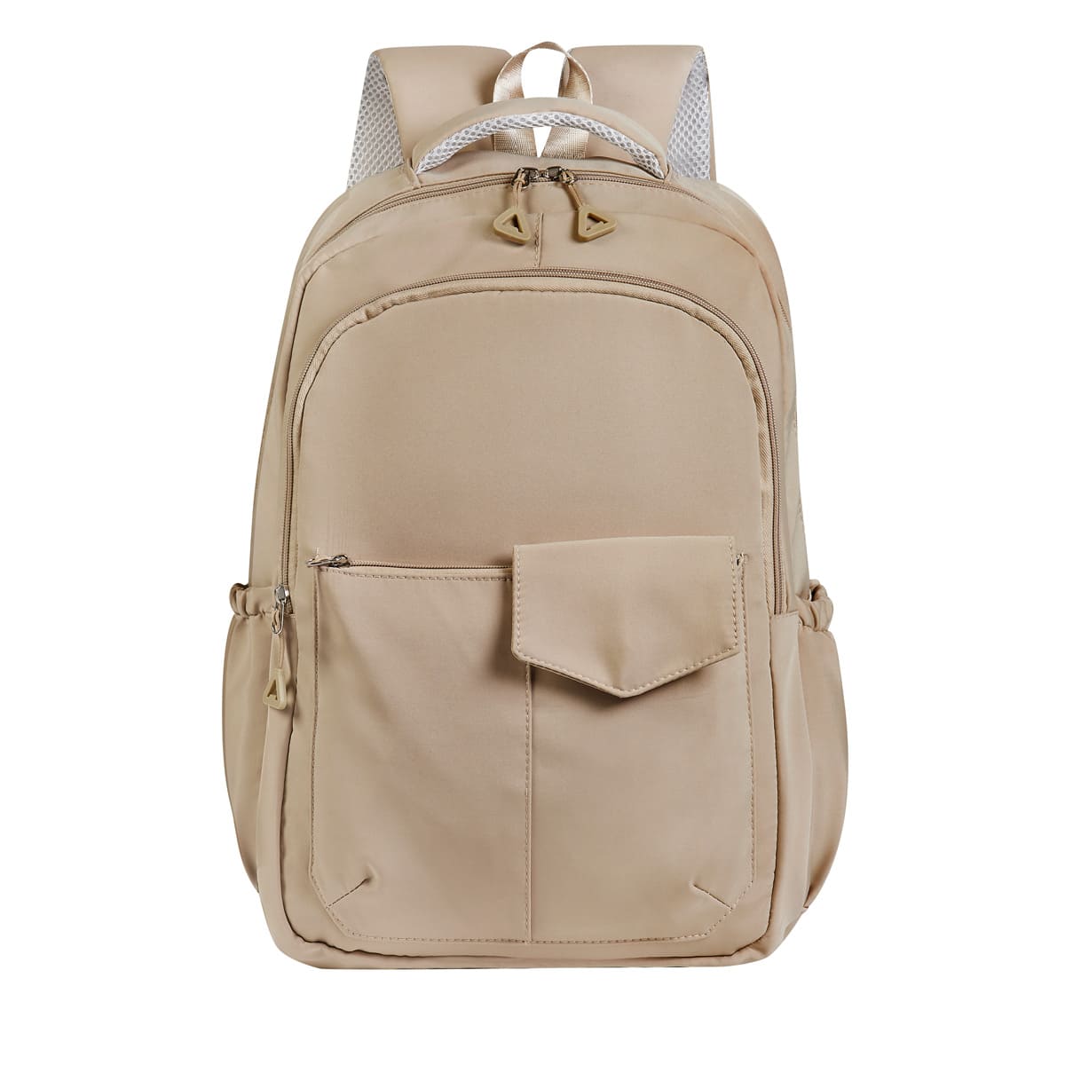 Mochila estilo casual. Su bolsa principal cuenta con un compartimento especial para laptop de hasta 15", ademas incluye bolsillos organizadores para mantener tus objetos personales ordenados y al alcance de tu mano. Al frente tiene dos bolsos con cierre y una solapa decorativa con broche magnetico que le anade un toque de elegancia y practicidad. Tambien cuenta con dos bolsillos laterales para llevar botellas u otros articulos esenciales. Su asa superior te permite llevarla comodamente; mientras que las asas para hombro acolchadas ofrecen un soporte ergonomico.