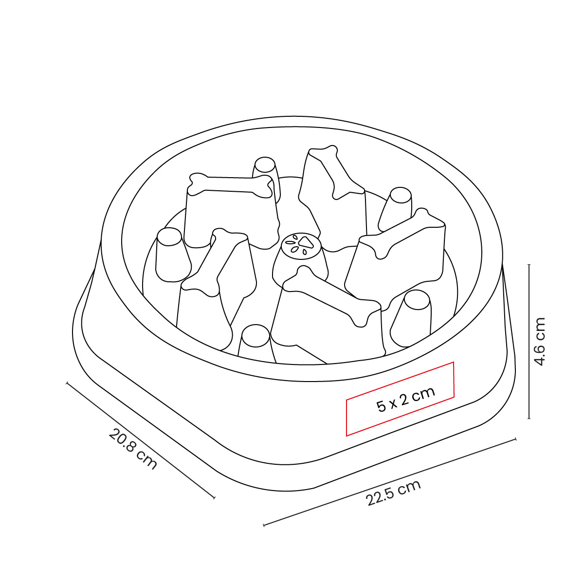 PLATO DE ALIMENTACION LENTA PARA MASCOTAS, FABRICADO EN plástico DE GRADO ALIMENTICIO. IDEAL PARA PERROS PEQUEÑOS Y MEDIANOS. SU DISEÑO INTERIOR CON FIGURAS DE HUESO AYUDA A REDUCIR LA VELOCIDAD AL COMER, FAVORECIENDO UNA DIGESTION SALUDABLE. SU BASE CUENTA CON SEIS ALMOHADILLAS ANTIDESLIZANTES, QUE EVITAN DESLIZAMIENTOS DURANTE SU USO.