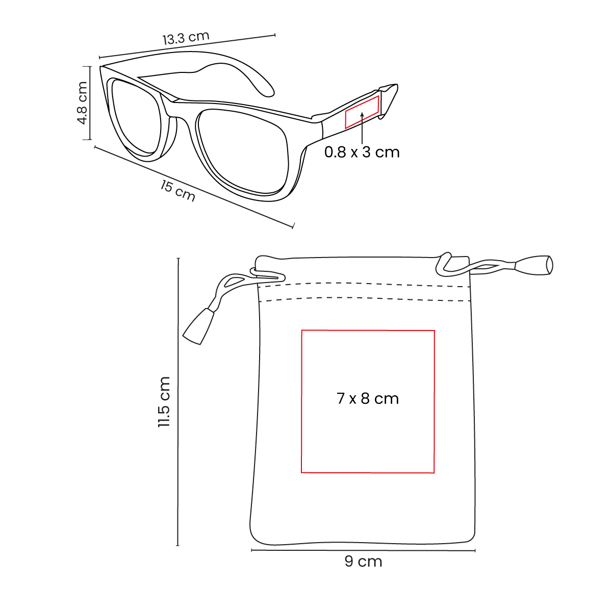 Área de impresión: 0.8 x 3 cm Lentes / 7 x 8 cm Bolsa