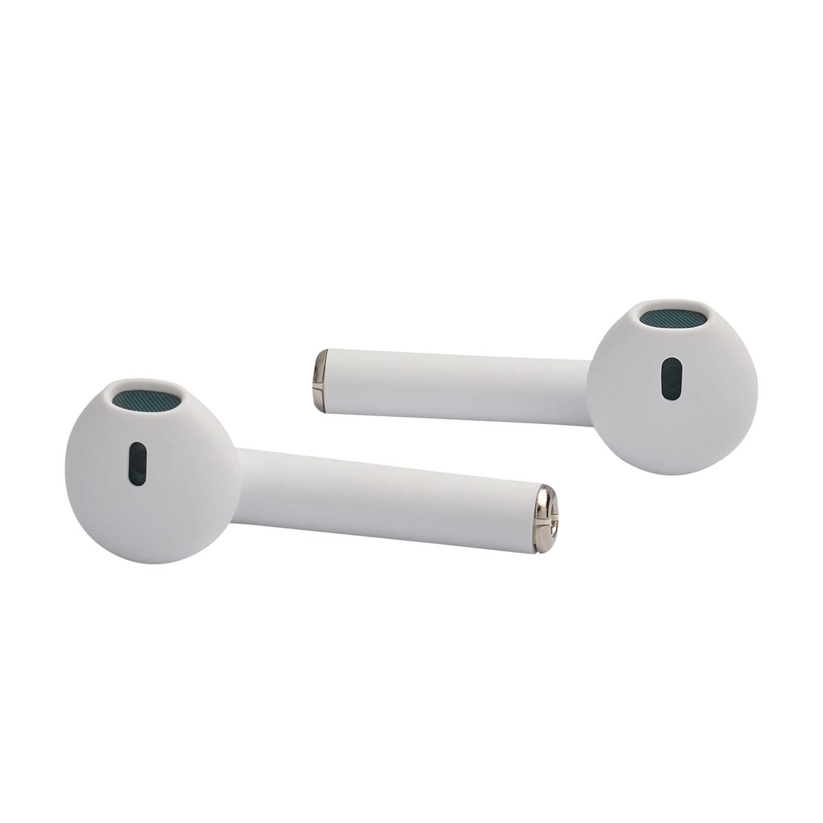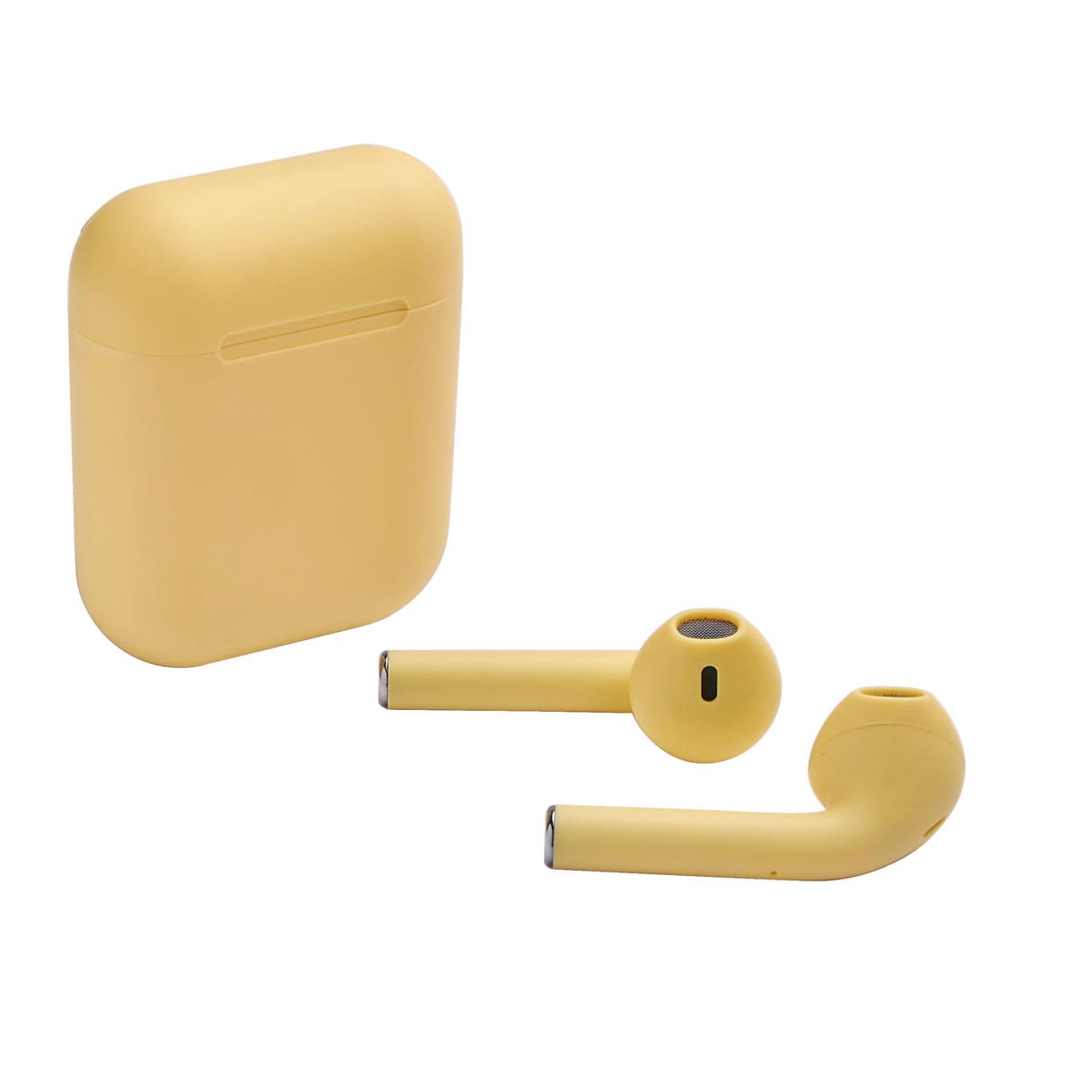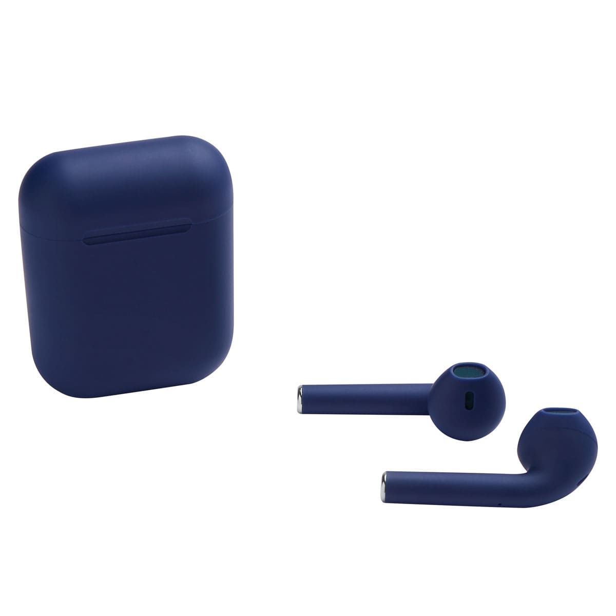 Audifonos bluetooth con terminado rubber y estuche recargable. Control touch para reproduccion de musica y funcion de llamada. Reproduccion de musica de 2 a 3 horas aproximadamente. Rango de conexion de 10 metros. Bateria de 30 mAh (audifonos) y 200 mAh (estuche). Incluye estuche con puerto lightning y cable auxiliar.