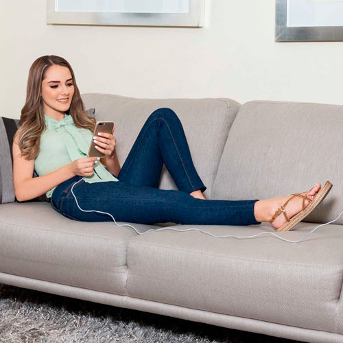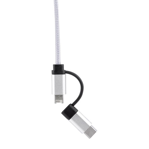 Cable cargador compatible con USB, 8 pin, micro USB y entrada tipo C. Longitud de cable 3m aproximadamente. Incluye estuche translucido.