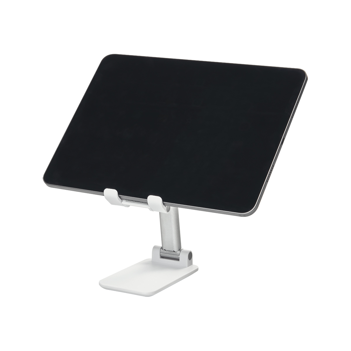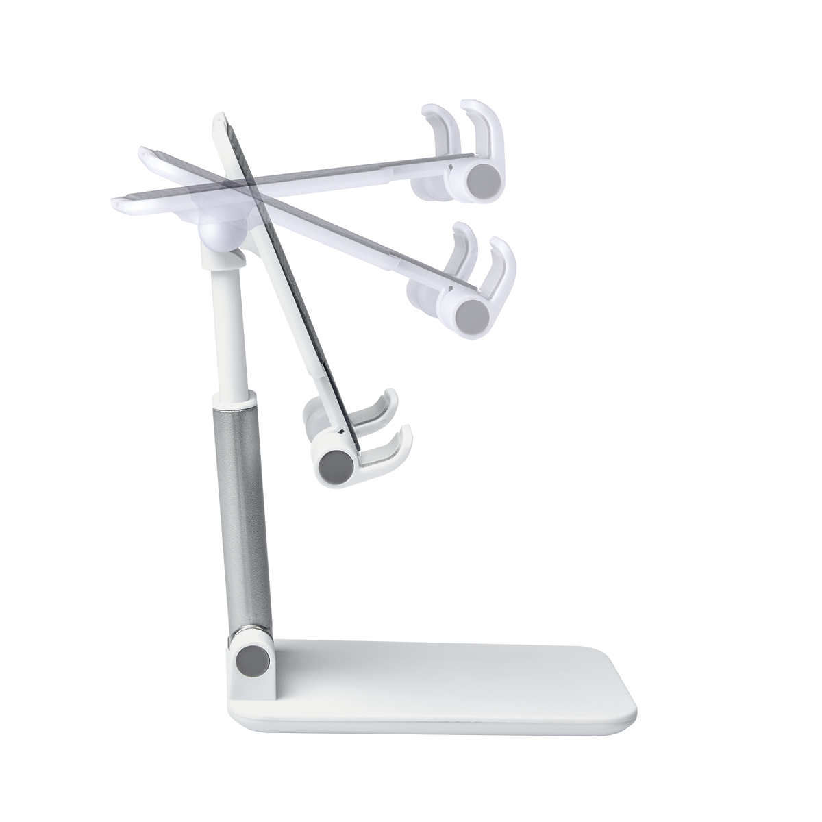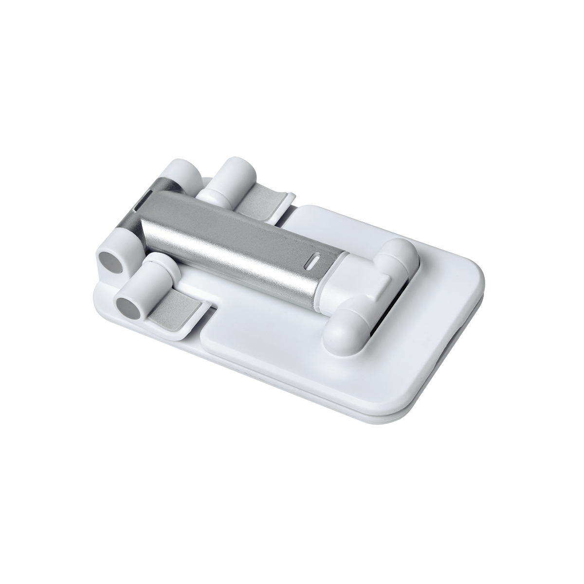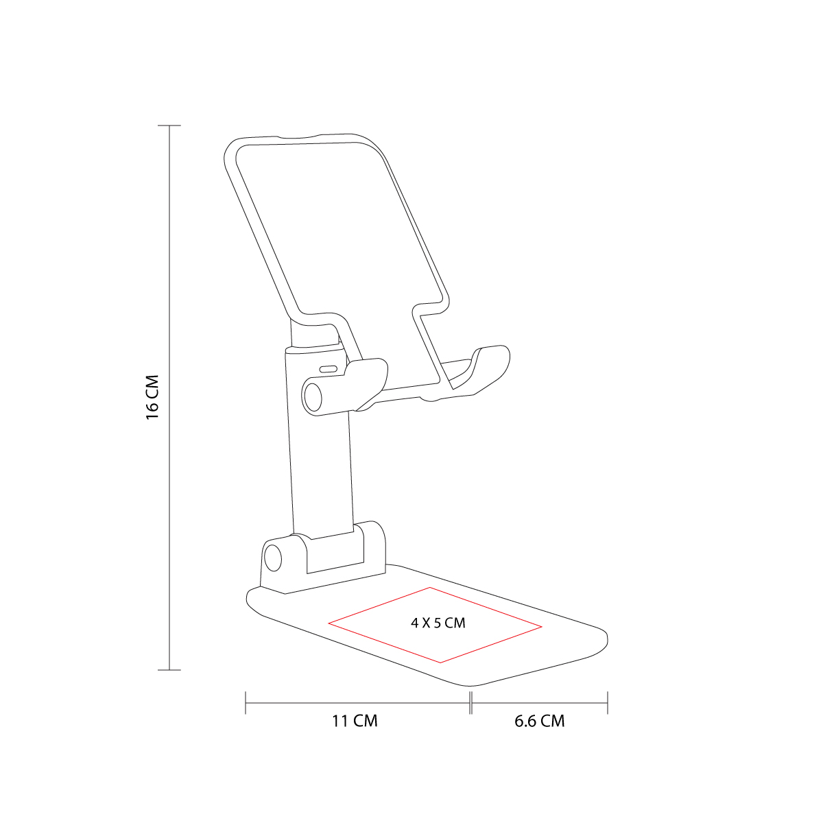 Soporte plegable. Soporte y base con material antiderrapante. Altura e inclinacion ajustable. Desplegable a una altura maxima de 16 cm.