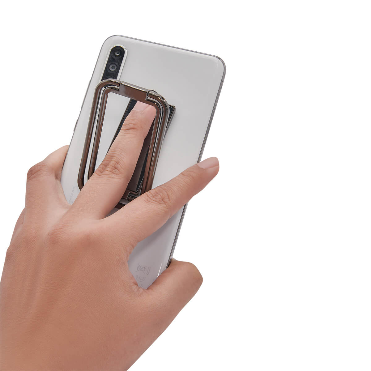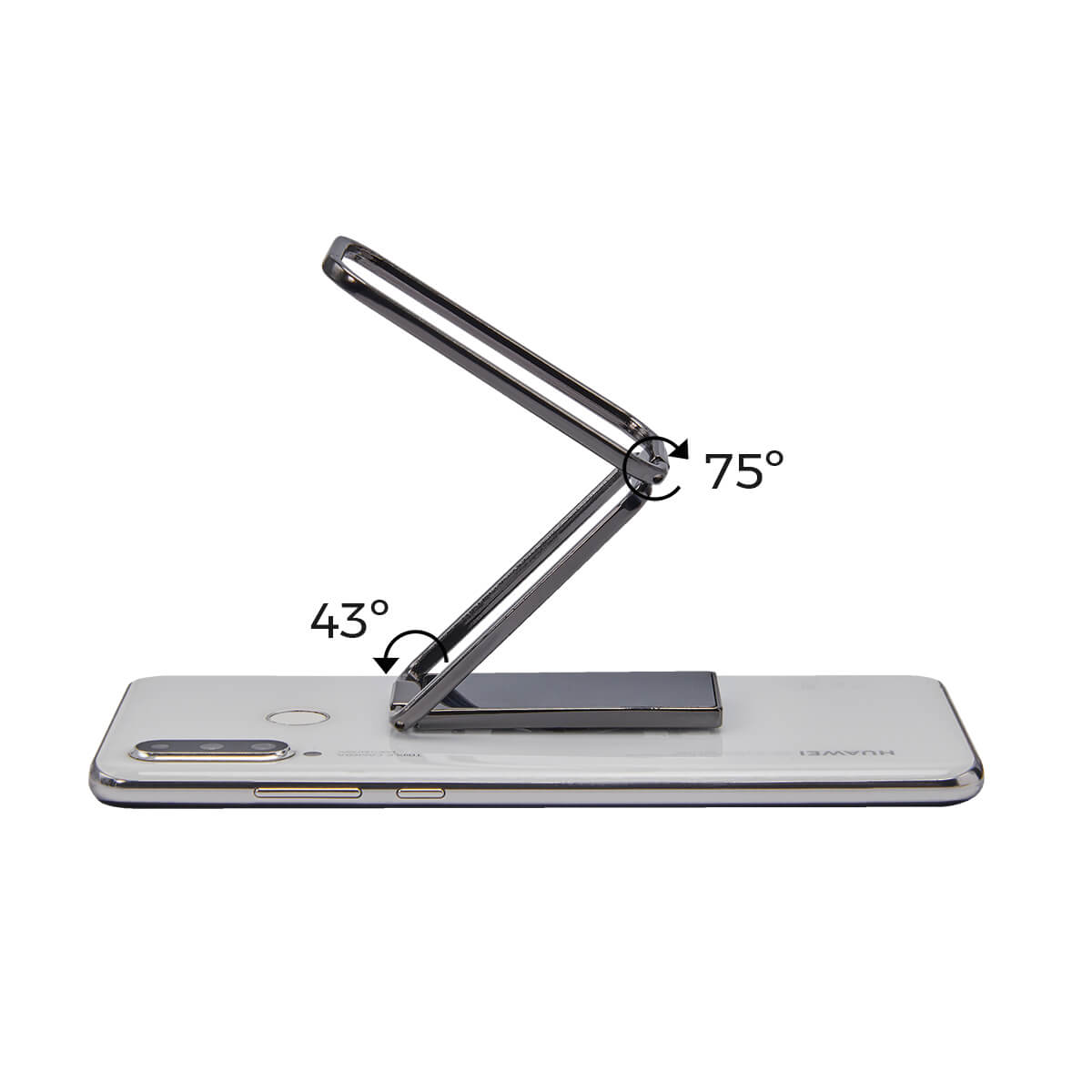Soporte adherible para smartphone o tablet. Diseno plegable para ajustar en diferentes posiciones, dos brazos ajustables para proporcionar mas angulos de vision y rotacion de 360° en la base.