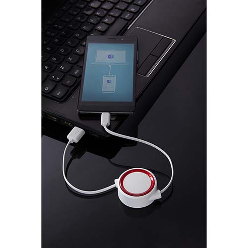 Cable retractil cargador y para transferencia de datos. Compatible con USB y micro USB. Incluye placa y marco circulares. Longitud de cable 73 cm aprox.