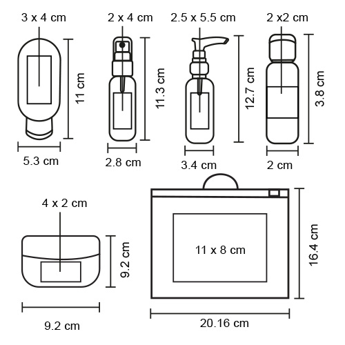 SET DE VIAJE CON 8 ACCESORIOS: 1 ATOMIZADOR, 1 BOTE CON DISPENSADOR, 2 BOTES CON TAPA DISC TOP, 1 BOTE, 1 RECIPIENTE PARA ALMACENAMIENTO, 1 MINI EMBUDO Y 1 PALITA. INCLUYE ESTUCHE.